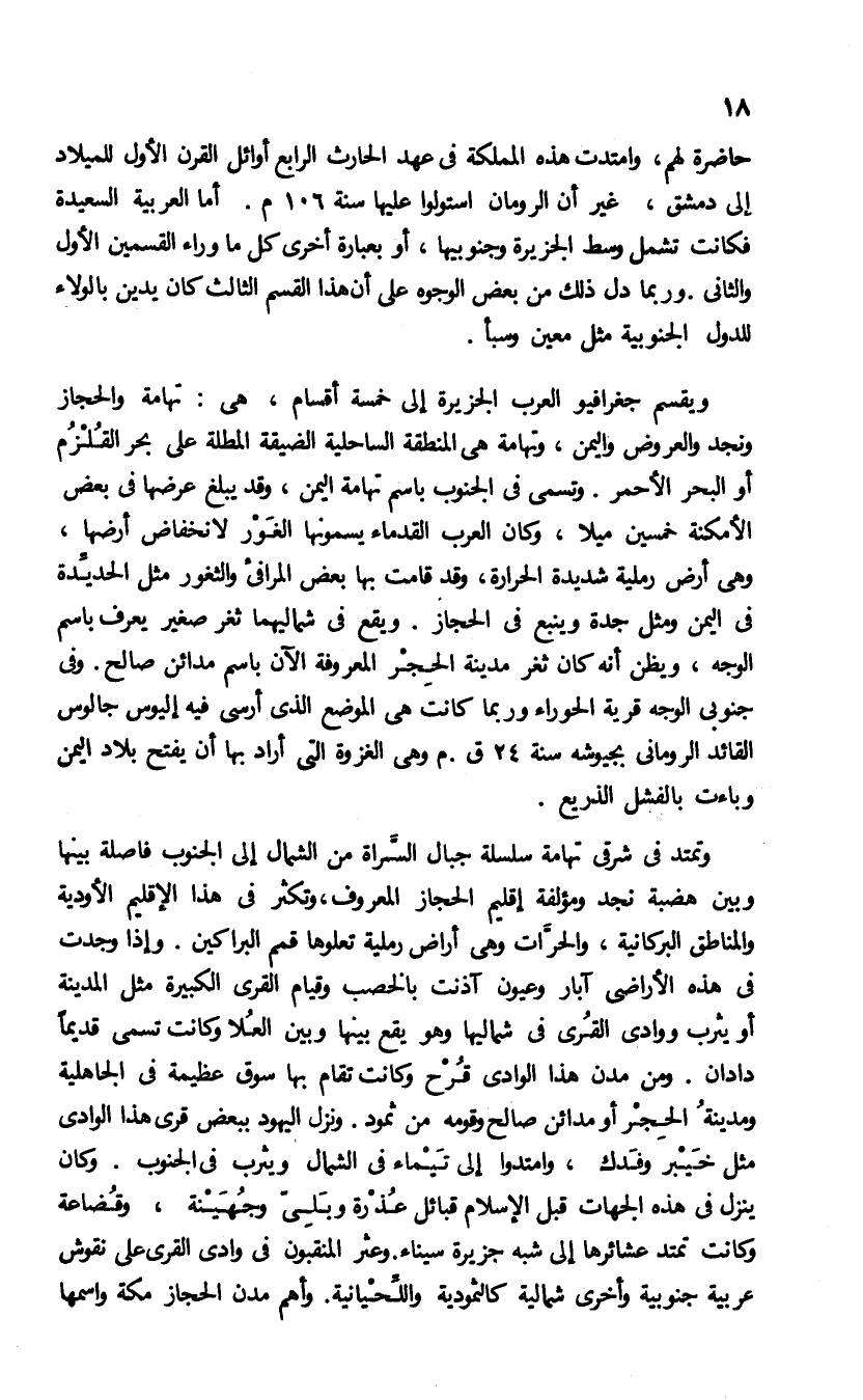 حاضرة لهم، وامتدت هذه المملكة فى عهد الحارث الرابع أوائل القرن الأول للميلاد إلى دمشق، غير أن الرومان استولوا عليها سنة 106 م. أما العربية السعيدة فكانت تشمل وسط الجزيرة وجنوبيها، أو بعبارة أخرى كل ما وراء القسمين الأول والثانى. وربما دل ذلك من بعض الوجوه على أن هذا القسم الثالث كان يدين بالولاء للدول الجنوبية مثل معين وسبأ.