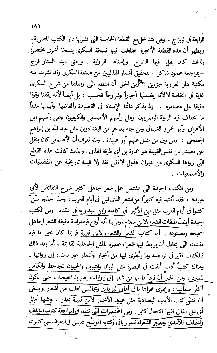 وهناك كتب أدب ألفت فى البصرة مثل البيان والتبيين والحيوان للجاحظ والكامل للمبرد، ومن الخير أن نرد ما بها من شعر إلى روايات بصرية صحيحة، حتى نكون أكثر طمأنينة. ويجرى مجراها ما فى أمالى اليزيدى ومجالس ثعلب من أشعار وينبغى أن نتلقى كتب الأدب البغدادية مثل عيون الأخبار لابن قتيبة بحذر، مثلها أمالى أبى على القالى ففيها انتحال كثير. ومن المختصرات التى تفيد فى المراجعة كتاب المؤتلف والمختلف للآمدى ومعجم الشعراء للمرزبانى وكتابه الموشّح نفيس فى التعرف على كثير مما وضع على الشعراء الجاهليين. وهناك أشعار جاهلية كثيرة فى كتب النقد مثل نقد الشعر لقدامة والصناعتين لأبى هلال العسكرى والوساطة بين المتنبى وخصومه للجرجانى والعمدة لابن رشيق، ومثلها مثل الشواهد المبثوثة فى كتب اللغة والنحو ينبغى التوثق منها بالرجوع إلى المصادر الأصلية الوثيقة. أما ما جاء فى كتب السير والأخبار والتاريخ كسيرة ابن هشام وتاريخ الطبرى ومغازى الواقدى فينبغى أن نرفضه إلا أن تدعمه روايات صحيحة.