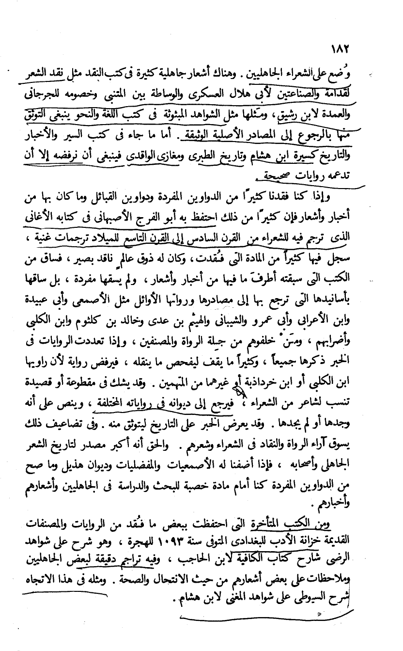 أخبار وأشعار فإن كثيرا من ذلك احتفظ به أبو الفرج الأصبهانى فى كتابه الأغانى الذى ترجم فيه للشعراء من القرن السادس إلى القرن التاسع للميلاد ترجمات غنية، سجل فيها كثيرا من المادة التى فقدت، وكان له ذوق عالم ناقد بصير، فساق من الكتب التى سبقته أطرف ما فيها من أخبار وأشعار، ولم يسقها مفردة، بل ساقها بأسانيدها التى ترجع بها إلى مصادرها ورواتها الأوائل مثل الأصمعى وأبى عبيدة وابن الأعرابى وأبى عمرو الشيبانى والهيثم بن عدى وخالد بن كلثوم وابن الكلبى وأضرابهم ومن خلفوهم من جلة الرواة والمصنفين. وإذا تعددت الروايات فى الخبر ذكرها جميعا، وكثيرا ما يقف ليفحص ما ينقله، فيرفض رواية لأن راويها ابن الكلبى أو ابن خرداذبة أو غيرهما من المتهمين. وقد يشك فى مقطوعة أو قصيدة تنسب لشاعر من الشعراء، فيرجع إلى ديوانه فى رواياته المختلفة، وينص على أنه وجدها أو لم يجدها، وقد يعرض الخبر على التاريخ ليتوثق منه. وفى تضاعيف ذلك يسوق آراء الرواة والنقاد فى الشعراء وشعرهم. والحق أنه أكبر مصدر لتاريخ الشعر الجاهلى وأصحابه، فإذا أضفنا له الأصمعيات والمفضليات وديوان هذيل وما صح من الدواوين المفردة كنا أمام مادة خصبة للبحث والدراسة فى الجاهليين وأشعارهم وأخبارهم.
