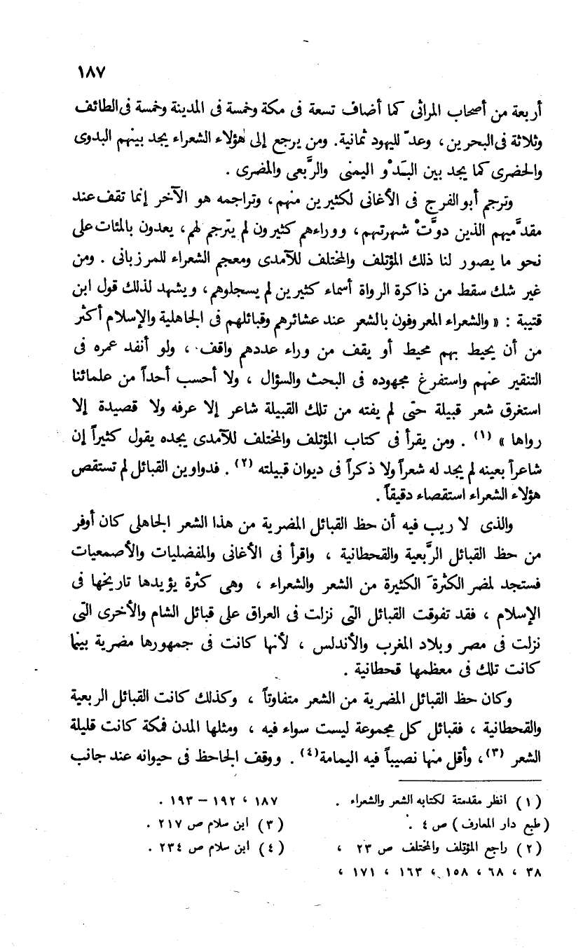 أربعة من أصحاب المراثى كما أضاف تسعة فى مكة وخمسة فى المدينة وخمسة فى الطائف وثلاثة فى البحرين، وعدّ لليهود ثمانية. ومن يرجع إلى هؤلاء الشعراء يجد بينهم البدوى والحضرى كما يجد بين البدو اليمنى والرّبعى والمضرى.