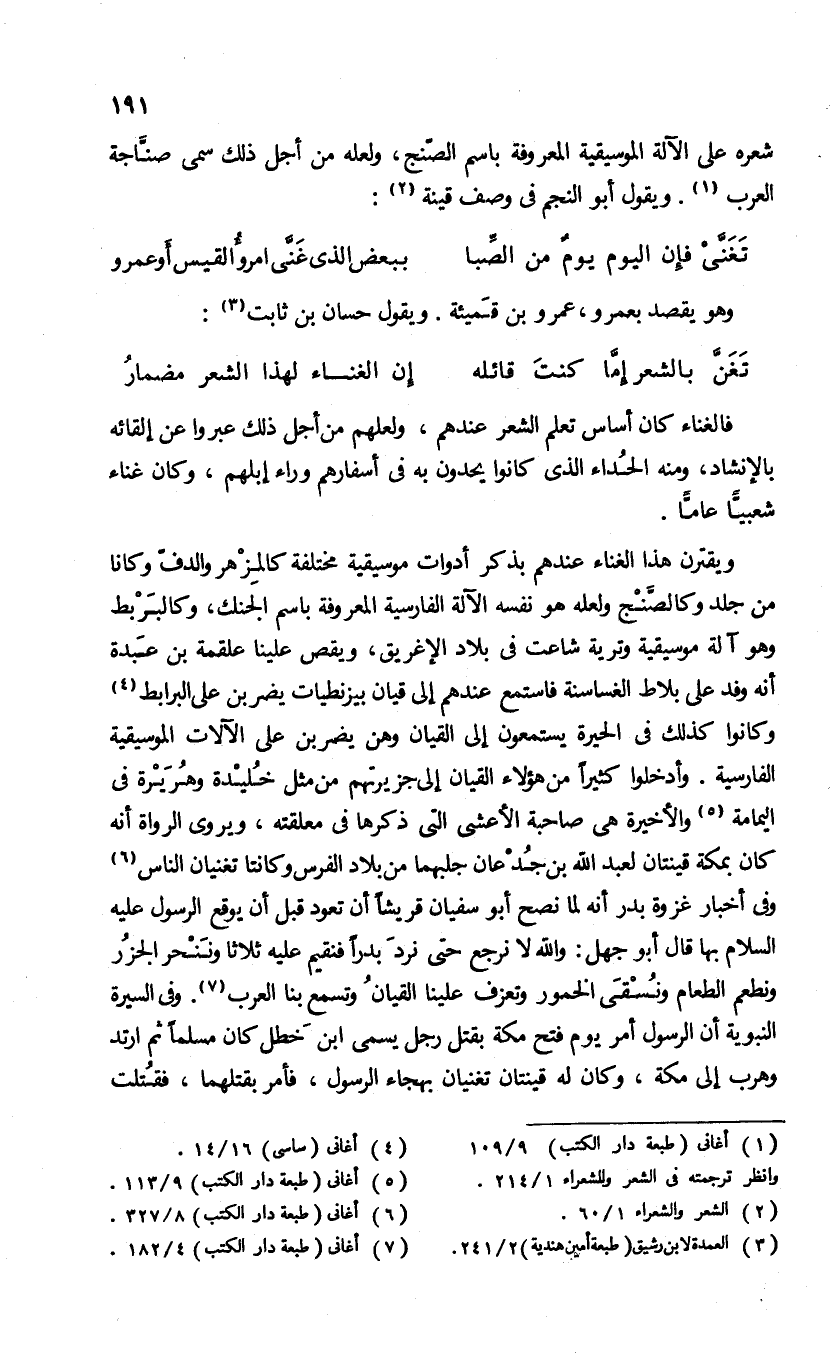 ويقترن هذا الغناء عندهم بذكر أدوات موسيقية مختلفة كالمزهر والدف وكانا من جلد وكالصّنج ولعله هو نفسه الآلة الفارسية المعروفة باسم الجنك، وكالبربط وهو آلة موسيقية وترية شاعت فى بلاد الإغريق، ويقص علينا علقمة بن عبدة أنه وفد على بلاط الغساسنة فاستمع عندهم إلى قيان بيزنطيات يضر بن على البرابط (¬4) وكانوا كذلك فى الحيرة يستمعون إلى القيان وهن يضربن على الآلات الموسيقية الفارسية. وأدخلوا كثيرا من هؤلاء القيان إلى جزيرتهم من مثل خليدة وهريرة فى اليمامة (¬5) والأخيرة هى صاحبة الأعشى التى ذكرها فى معلقته. ويروى الرواة أنه كان بمكة قينتان لعبد الله بن جدعان جلبهما من بلاد الفرس وكانتا تغنيان الناس (¬6) وفى أخبار غزوة بدر أنه لما نصح أبو سفيان قريشا أن تعود قبل أن يوقع الرسول عليه السلام بها قال أبو جهل: والله لا نرجع حتى نرد بدرا فنقيم عليه ثلاثا وننحر الجزر ونطعم الطعام ونسقى الخمور وتعزف علينا القيان وتسمع بنا العرب (¬7). وفى السيرة النبوية أن الرسول أمر يوم فتح مكة بقتل رجل يسمى ابن خطل كان مسلما ثم ارتد وهرب إلى مكة، وكان له قينتان تغنيانه بهجاء الرسول، فأمر بقتلهما، فقتلت