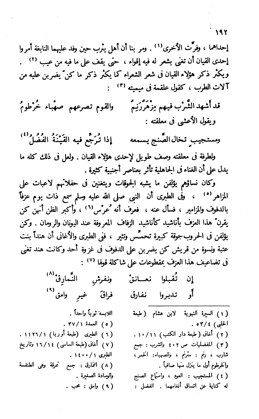 وكان نساؤهم يؤلفن ما يشبه الجوقات ويتغنين فى حفلاتهم لاعبات على المزاهر (¬5)، وفى الطبرى أن النبى صلى الله عليه وسلم سمع ذات يوم عزفا بالدفوف والمزامير، فسأل عنه، فعرف أنه عرس (¬6)، وأكبر الظن أنهن كن يقرنّ هذا العزف بأناشيد كأناشيد الزفاف المعروفة عند اليونان والرومان. وكن يؤلفن فى الحروب جوقة كبيرة تحمّس وتثير، ففى الطبرى والأغانى أن هندا بنت عتبة ونسوة من قريش كن يضربن على الدفوف فى غزوة أحد وكانت هند تغنى فى تضاعيف هذا العزف بمقطوعات على شاكلة قولها (¬7):