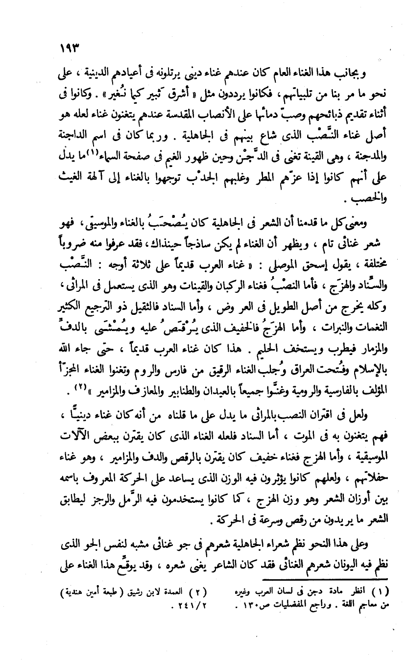 ولعل فى اقتران النصب بالمراثى ما يدل على ما قلناه من أنه كان غناء دينيّا، فهم يتغنون به فى الموت، أما السناد فلعله الغناء الذى كان يقترن ببعض الآلات الموسيقية، وأما الهزج فغناء خفيف كان يقترن بالرقص والدف والمزامير، وهو غناء حفلاتهم، ولعلهم كانوا يؤثرون فيه الوزن الذى يساعد على الحركة المعروف باسمه بين أوزان الشعر وهو وزن الهزج، كما كانوا يستخدمون فيه الرّمل والرجز ليطابق الشعر ما يريدون من رقص وسرعة فى الحركة.