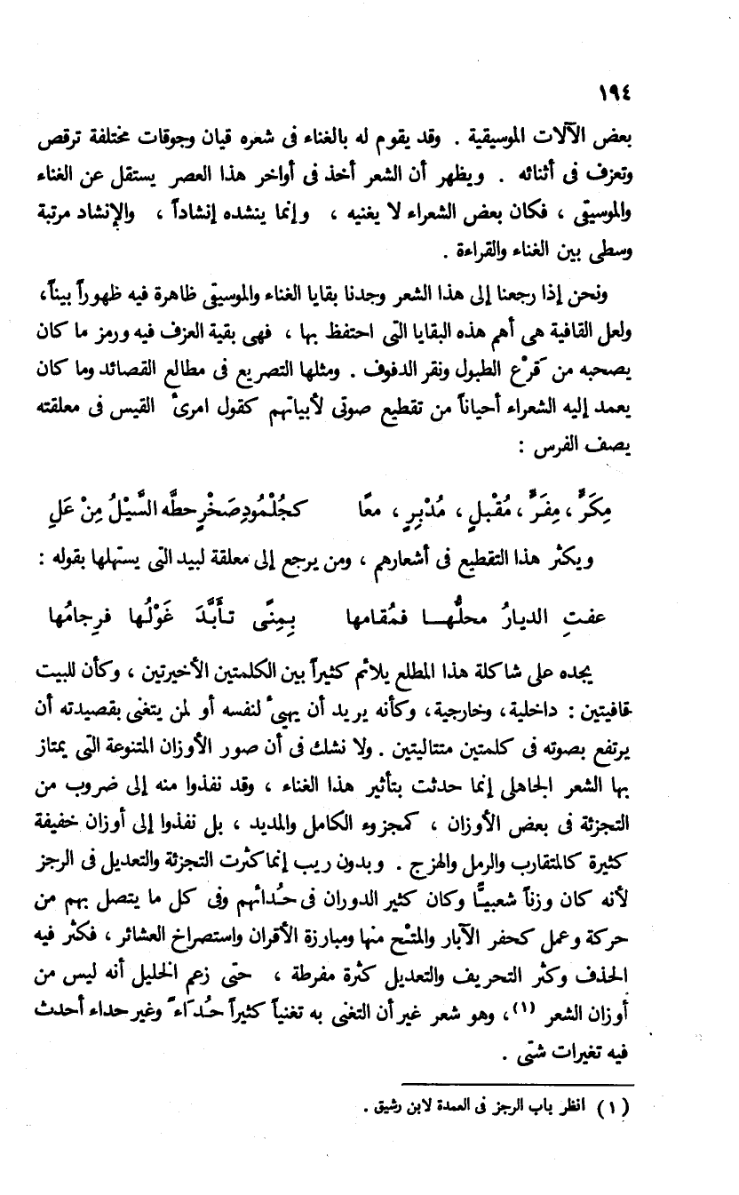 ونحن إذا رجعنا إلى هذا الشعر وجدنا بقايا الغناء والموسيقى ظاهرة فيه ظهورا بينا، ولعل القافية هى أهم هذه البقايا التى احتفظ بها، فهى بقية العزف فيه ورمز ما كان يصحبه من قرع الطبول ونقر الدفوف. ومثلها التصريع فى مطالع القصائد وما كان يعمد إليه الشعراء أحيانا من تقطيع صوتى لأبياتهم كقول امرئ القيس فى معلقته يصف الفرس: