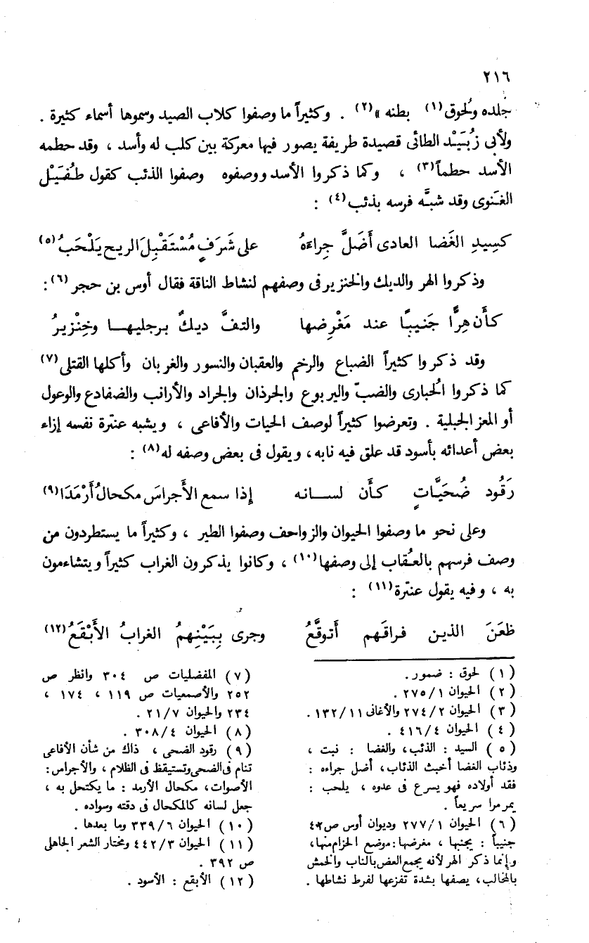 وقد ذكروا كثيرا الضباع والرخم والعقبان والنسور والغربان وأكلها القتلى (¬7) كما ذكروا الحبارى والضب واليربوع والجرذان والجراد والأرانب والضفادع والوعول أو المعز الجبلية، وتعرضوا كثيرا لوصف الحيات والأفاعى، ويشبه عنترة نفسه إزاء بعض أعدائه بأسود قد علق فيه نابه، ويقول فى بعض وصفه له (¬8):