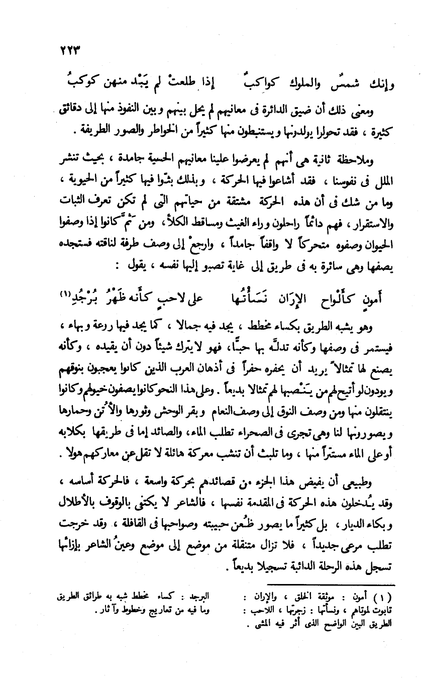 وهو يشبه الطريق بكساء مخطط، يجد فيه جمالا، كما يجد فيها روعة وبهاء، فيستمر فى وصفها وكأنه تدلّه بها حبّا، فهو لا يترك شيئا دون أن يقيده، وكأنه يصنع لها تمثالا يريد أن يحفره حفرا فى أذهان العرب الذين كانوا يعجبون بنوقهم ويودون لو أتيح لهم من ينصبها لهم تمثالا بديعا. وعلى هذا النحو كانوا يصفون خيولهم وكانوا ينتقلون منها ومن وصف النوق إلى وصف النعام وبقر الوحش وثورها والأتن وحمارها ويصورونها لنا وهى تجرى فى الصحراء تطلب الماء، والصائد إما فى طريقها بكلابه أو على الماء مستترا منها، وما تلبث أن تنشب معركة هائلة لا تقل عن معاركهم هولا.