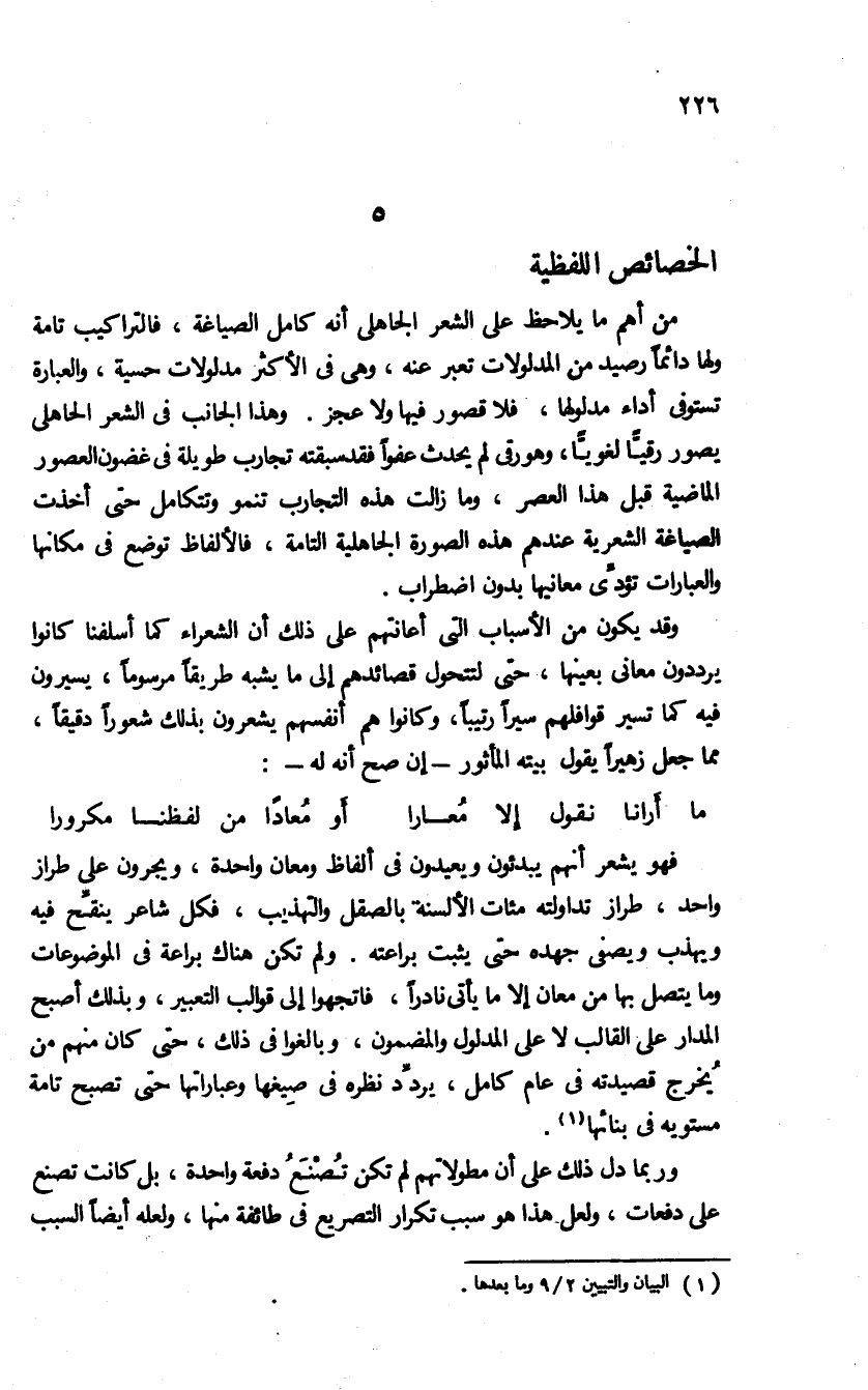 من أهم ما يلاحظ على الشعر الجاهلى أنه كامل الصياغة، فالتراكيب تامة ولها دائما رصيد من المدلولات تعبر عنه، وهى فى الأكثر مدلولات حسية، والعبارة تستوفى أداء مدلولها، فلا قصور فيها ولا عجز. وهذا الجانب فى الشعر الحاهلى يصور رقيّا لغويّا، وهو رقى لم يحدث عفوا فقد سبقته تجارب طويلة فى غضون العصور الماضية قبل هذا العصر، وما زالت هذه التجارب تنمو وتتكامل حتى أخذت الصياغة الشعرية عندهم هذه الصورة الجاهلية التامة، فالألفاظ توضع فى مكانها والعبارات تؤدّى معانيها بدون اضطراب.