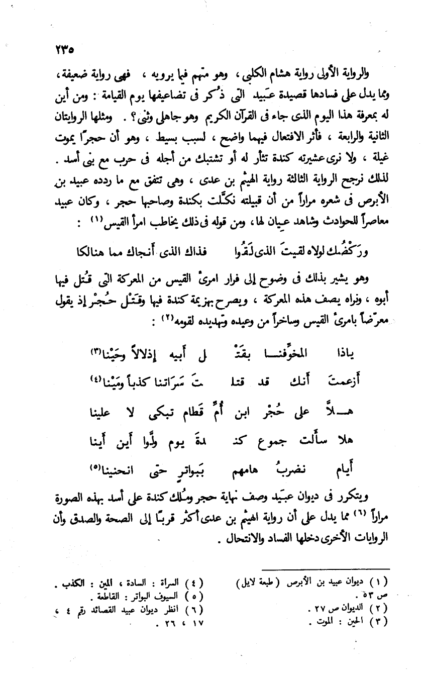 ويتكرر فى ديوان عبيد وصف نهاية حجر وملك كندة على أسد بهذه الصورة مرارا (¬6) مما يدل على أن رواية الهيثم بن عدى أكثر قربا إلى الصحة والصدق وأن الروايات الأخرى دخلها الفساد والانتحال.