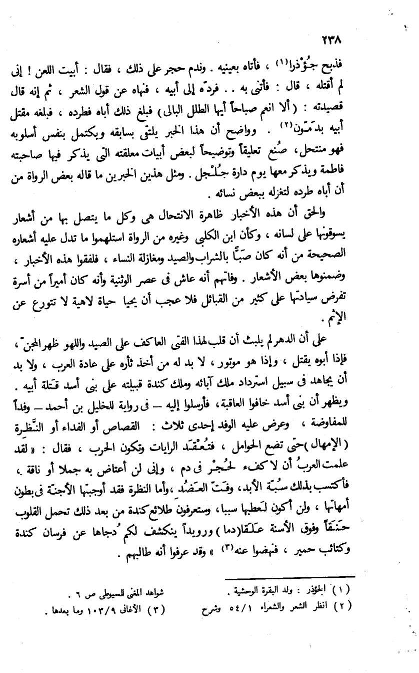والحق أن هذه الأخبار ظاهرة الانتحال هى وكل ما يتصل بها من أشعار يسوقونها على لسانه، وكأن ابن الكلبى وغيره من الرواة استلهموا ما تدل عليه أشعاره الصحيحة من أنه كان صبّا بالشراب والصيد ومغازلة النساء، فلفقوا هذه الأخبار، وضمنوها بعض الأشعار. وفاتهم أنه عاش فى عصر الوثنية وأنه كان أميرا من أسرة تفرض سيادتها على كثير من القبائل فلا عجب أن يحيا حياة لاهية لا تتورع عن الإثم.