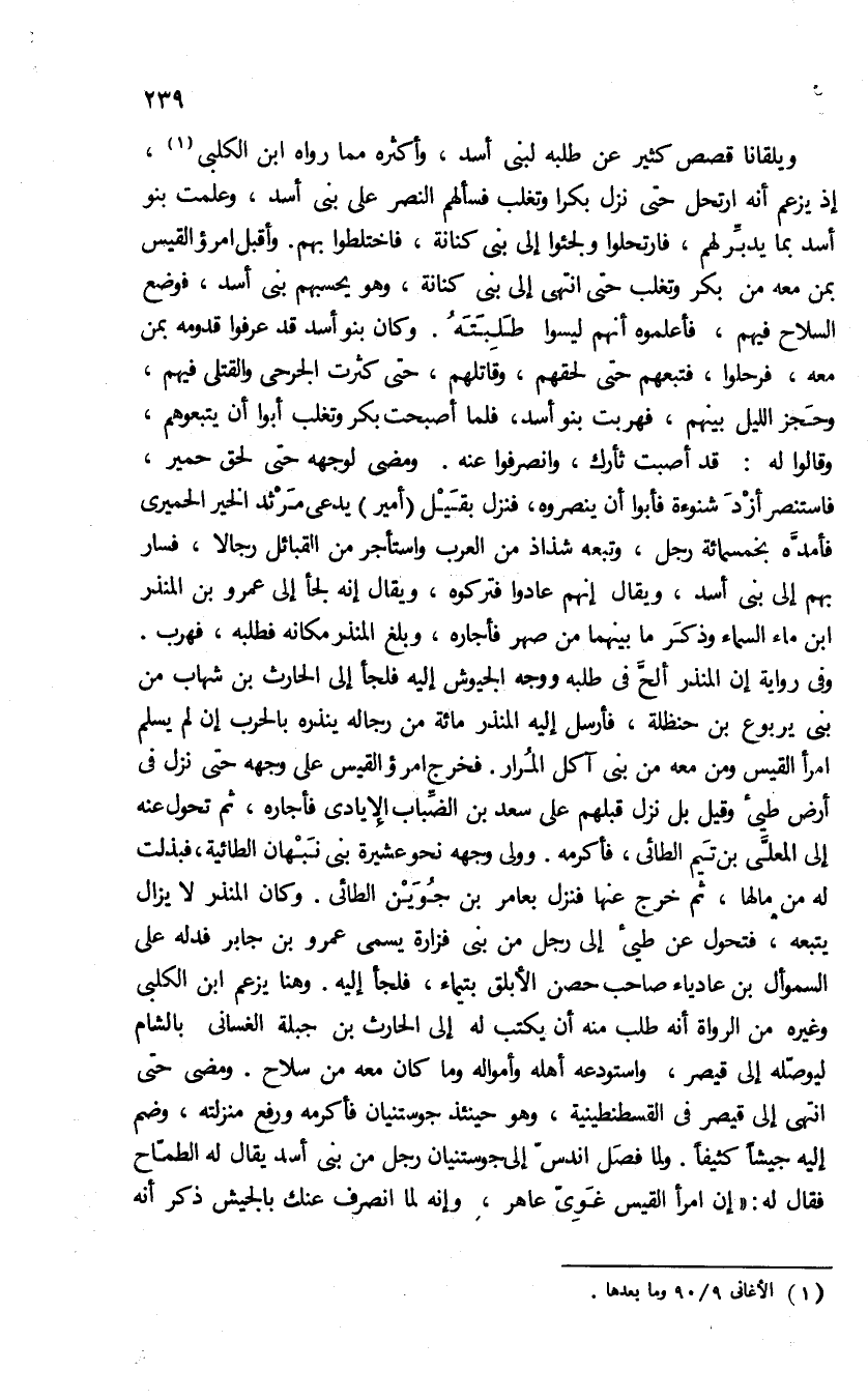 ويلقانا قصص كثير عن طلبه لبنى أسد، وأكثره مما رواه ابن الكلبى (¬1)، إذ يزعم أنه ارتحل حتى نزل بكرا وتغلب فسألهم النصر على بنى أسد، وعلمت بنو أسد بما يدبّر لهم، فارتحلوا ولجئوا إلى بنى كنانة، فاختلطوا بهم. وأقبل امرؤ القيس بمن معه من بكر وتغلب حتى انتهى إلى بنى كنانة، وهو يحسبهم بنى أسد، فوضع السلاح فيهم، فأعلموه أنهم ليسوا طلبته. وكان بنو أسد قد عرفوا قدومه بمن معه، فرحلوا، فتبعهم حتى لحقهم، وقاتلهم، حتى كثرت الجرحى والقتلى فيهم، وحجز الليل بينهم، فهربت بنو أسد، فلما أصبحت بكر وتغلب أبوا أن يتبعوهم، وقالوا له: قد أصبت ثأرك، وانصرفوا عنه. ومضى لوجهه حتى لحق حمير، فاستنصر أزد شنوءة فأبوا أن ينصروه، فنزل بقيل (أمير) يدعى مرثد الخير الحميرى فأمدّه بخمسمائة رجل، وتبعه شذاذ من العرب واستأجر من القبائل رجالا، فسار بهم إلى بنى أسد، ويقال إنهم عادوا فتركوه، ويقال إنه لجأ إلى عمرو بن المنذر ابن ماء السماء وذكر ما بينهما من صهر فأجاره، وبلغ المنذر مكانه فطلبه، فهرب.