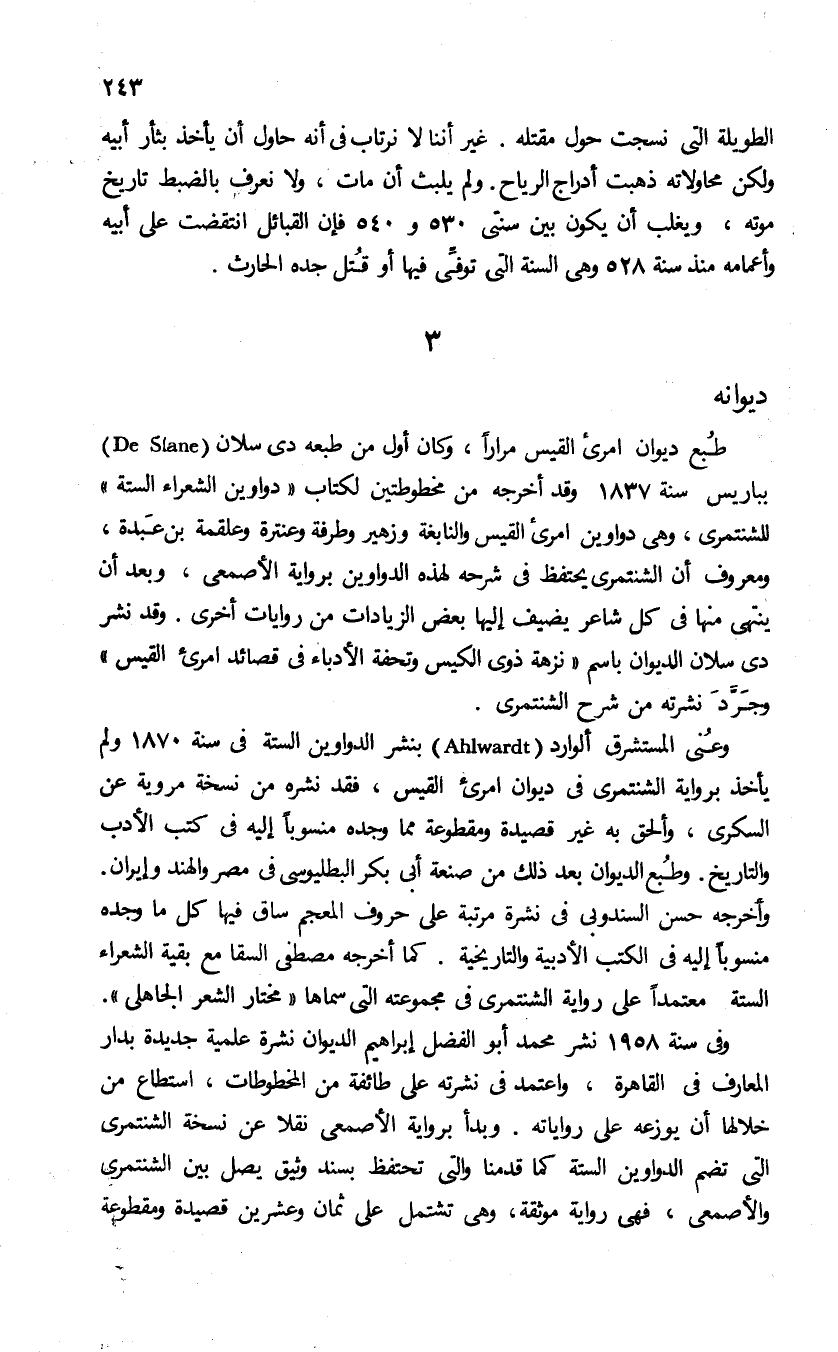 وعنى المستشرق ألوارد (Ahlwardt) بنشر الدواوين الستة فى سنة 1870 ولم يأخذ برواية الشنتمرى فى ديوان امرئ القيس، فقد نشره من نسخة مروية عن السكرى، وألحق به غير قصيدة ومقطوعة مما وجده منسوبا إليه فى كتب الأدب والتاريخ. وطبع الديوان بعد ذلك من صنعة أبى بكر البطليوسى فى مصر والهند وإيران.