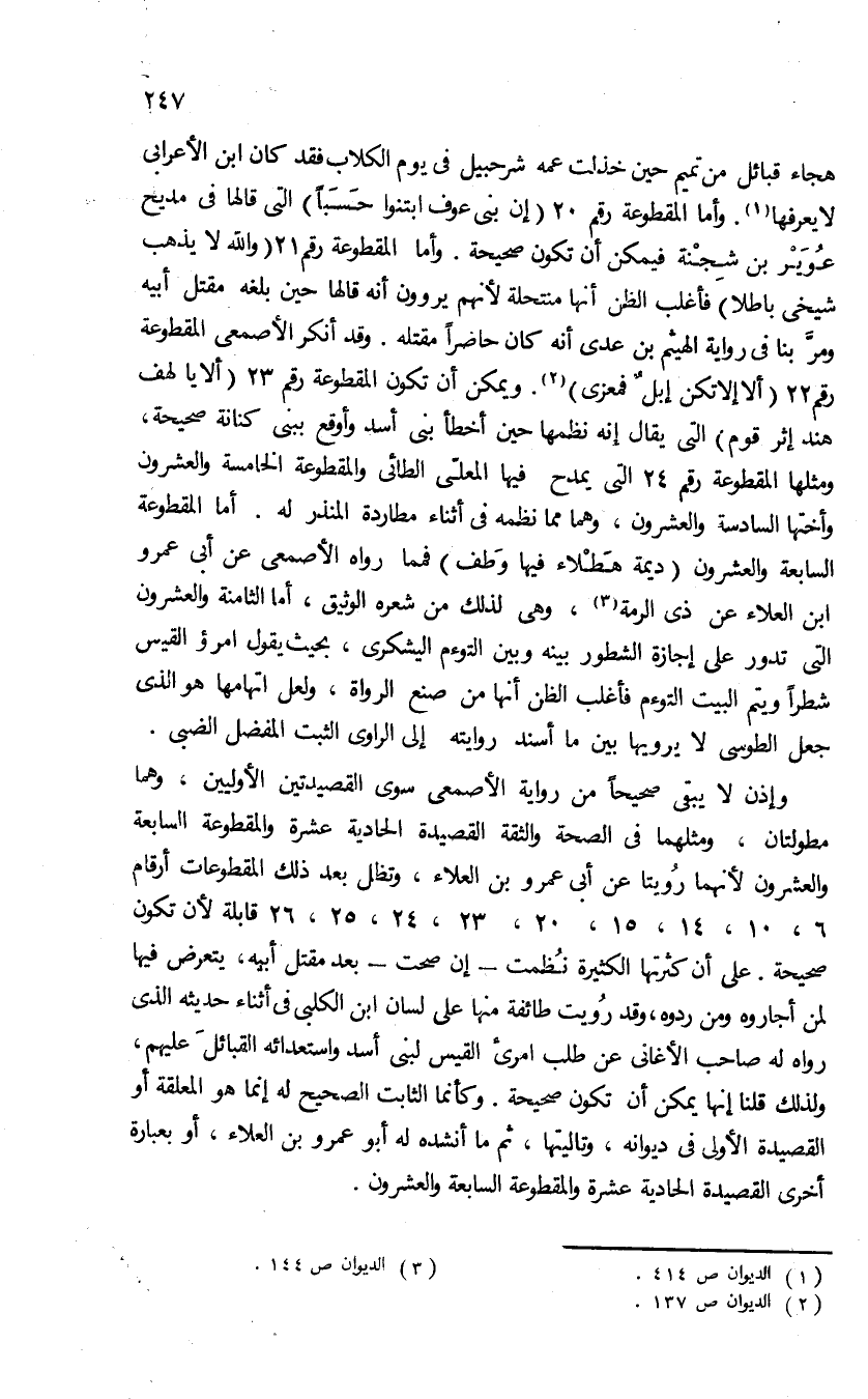 هجاء قبائل من تميم حين خذلت عمه شرحبيل فى يوم الكلاب فقد كان ابن الأعرابى لا يعرفها (¬1). وأما المقطوعة رقم 20 (إن بنى عوف ابتنوا حسبا) التى قالها فى مديح عوير بن شجنة فيمكن أن تكون صحيحة. وأما المقطوعة رقم 21 (والله لا يذهب شيخى باطلا) فأغلب الظن أنها منتحلة لأنهم يروون أنه قالها حين بلغه مقتل أبيه ومرّ بنا فى رواية الهيثم بن عدى أنه كان حاضرا مقتله. وقد أنكر الأصمعى المقطوعة رقم 22 (ألا إلا تكن إبل فمعزى) (¬2). ويمكن أن تكون المقطوعة رقم 23 (ألا يا لهف هند إثر قوم) التى يقال إنه نظمها حين أخطأ بنى أسد وأوقع ببنى كنانة صحيحة، ومثلها المقطوعة رقم 24 التى يمدح فيها المعلّى الطائى والمقطوعة الخامسة والعشرون وأختها السادسة والعشرون، وهما مما نظمه فى أثناء مطاردة المنذر له. أما المقطوعة السابعة والعشرون (ديمة هطلاء فيها وطف) فمما رواه الأصمعى عن أبى عمرو ابن العلاء عن ذى الرمة (¬3)، وهى لذلك من شعره الوثيق، أما الثامنة والعشرون التى تدور على إجازة الشطور بينه وبين التوءم اليشكرى، بحيث يقول امرؤ القيس شطرا ويتم البيت التوءم فأغلب الظن أنها من صنع الرواة، ولعل اتهامها هو الذى جعل الطوسى لا يرويها بين ما أسند روايته إلى الراوى الثبت المفضل الضبى.