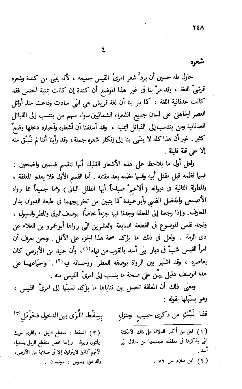 حاول طه حسين أن يردّ شعر امرئ القيس جميعه، لأنه يمنى من كندة وشعره قرشىّ اللغة، وقد مرّ بنا فى غير هذا الموضع أن كندة إن كانت يمنية الجنس فقد كانت عدنانية اللغة، كما مر بنا أن لغة قريش هى التى سادت وذاعت منذ أوائل العصر الجاهلى على لسان جميع الشعراء الشماليين سواء منهم من ينتسب إلى القبائل العدنانية ومن ينتسب إلى القبائل اليمنية، وقد أسلفنا أن أشعاره وأخباره دخلها وضع كثير. غير أن هذا كله لا ينتهى بنا إلى إنكار شعره جملة، وقد رأينا أننا لم نبق منه إلا على قلة قليلة.