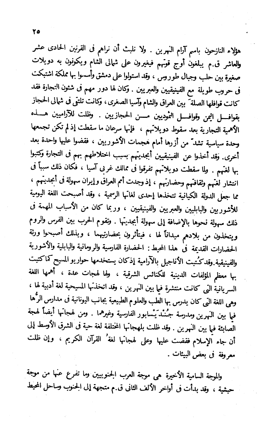 هؤلاء النازحون باسم آرام النهرين. ولا نلبث أن نراهم فى القرنين الحادى عشر والعاشر ق. م يبلغون أوج قوتهم فيغيرون على شمالى الشام ويكونون به دويلات صغيرة بين حلب وجبال طوروس، وقد استولوا على دمشق وأسسوا بها مملكة اشتبكت فى حروب طويلة مع الفينيقيين والعبريين. وكان لها دور مهم فى شئون التجارة فقد كانت قوافلها الصلة بين العراق والشام وآسيا الصغرى، وكانت تلتقى فى شمالى الحجاز بقوافل اليمن وقوافل الثموديين من الحجازيين. وظلت للآراميين هذه الأهمية التجارية بعد سقوط دويلاتهم، فإنها سرعان ما سقطت إذ لم تكن تجمعها وحدة سياسية تشدّ من أزرها أمام هجمات الأشوريين، فقضوا عليها واحدة بعد أخرى. وقد أخذوا عن الفينيقيين أبجديتهم بسبب اختلاطهم بهم فى التجارة وكتبوا بها لغتهم. ولما سقطت دويلاتهم تفرقوا فى ممالك غربى آسيا. فكان ذلك سببا فى انتشار لغتهم وثقافتهم وحضارتهم، إذ وجدت أمم العراق وإيران سهولة فى أبجديتهم، مما جعل الدولة الكيانية تتخذها إحدى لغاتها الرسمية، وقد أصبحت اللغة اليومية للأشوريين والبابليين والعبريين والفينيقيين، وربما كان من الأسباب المهمة فى ذلك سهولة نحوها بالإضافة إلى سهولة أبجديتها. وتقوم الحرب بين الفرس والروم ويتخذون من بلادهم ميدانا لها، فيتأثرون بحضارتيهما، وبذلك أصبحوا ورثة الحضارات القديمة فى هذا المحيط: الحضارة الفارسية والرومانية والبابلية والأشورية والفينيقية. وقد كتبت الاناجيل بالآرامية إذ كان يستخدمها حواريو المسيح كما كتبت بها معظم المؤلفات الدينية للكنائس الشرقية، ولها لجهات عدة، أهمها اللغة السريانية التى كانت منتشرة فيما بين النهرين، وقد اتخذتها المسيحية لغة أدبية لها، وهى اللغة التى كان يدرس بها الطب والعلوم الطبيعية بجانب اليونانية فى مدارس الرّها فيما بين النهرين ومدرسة جنديسابور الفارسية وغيرهما. ومن لهجاتها أيضا لهجة الصابئة فيما بين النهرين. وقد ظلت بلهجاتها المختلفة لغة حية فى الشرق الأوسط إلى أن جاء الإسلام فقضت عليها وعلى لهجاتها لغة القرآن الكريم، وإن ظلت معروفة فى بعض البيئات.