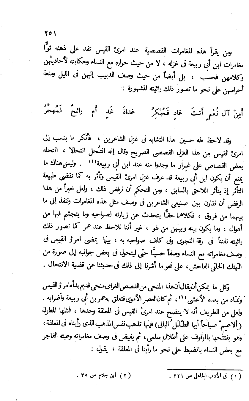 ومن يقرأ هذه المغامرات القصصية عند امرئ القيس تفد على ذهنه توّا مغامرات ابن أبى ربيعة فى غزله، لا من حيث حواره مع النساء وحكايته لأحاديثهن وكلامهن فحسب، بل أيضا من حيث وصف الدبيب إليهن فى الليل ومنعة أحراسهن على نحو ما تصور ذلك رائيته المشهورة: