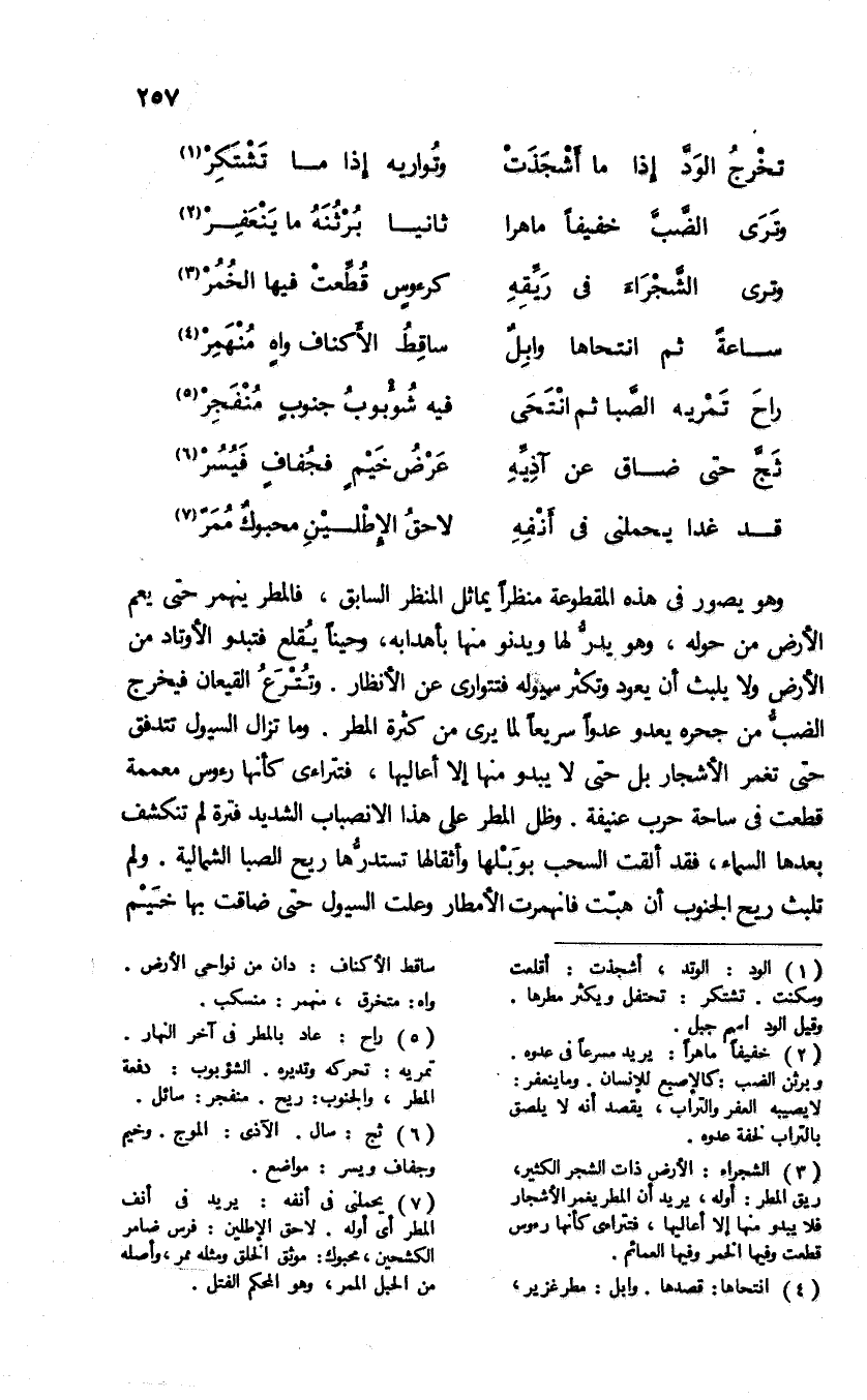 وهو يصور فى هذه المقطوعة منظرا يماثل المنظر السابق، فالمطر ينهمر حتى يعم الأرض من حوله، وهو يدرّ لها ويدنو منها بأهدابه، وحينا يقلع فتبدو الأوتاد من الأرض ولا يلبث أن يعود وتكثر سيوله فتتوارى عن الأنظار. وتترع القيعان فيخرج الضبّ من جحره يعدو عدوا سريعا لما يرى من كثرة المطر. وما تزال السيول تتدفق حتى تغمر الأشجار بل حتى لا يبدو منها إلا أعاليها، فتتراءى كأنها رءوس معممة قطعت فى ساحة حرب عنيفة. وظل المطر على هذا الانصباب الشديد فترة لم تنكشف بعدها السماء، فقد ألقت السحب بوبلها وأثقالها تستدرّها ريح الصبا الشمالية. ولم تلبث ريح الجنوب أن هبّت فانهمرت الأمطار وعلت السيول حتى ضاقت بها خيم