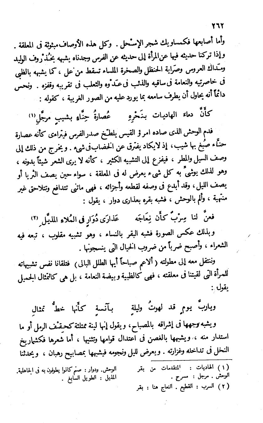 وأما أصابعها فكمساويك شجر الإسحل. وكل هذه الأوصاف مبثوثة فى المعلقة، وإذا تركنا حديثه فيها عن المرأة إلى حديثه عن الفرس وجدناه يشبهه بخذروف الوليد ومداك العروس وصراية الحنظل والصخرة الملساء تسقط من عل، كما يشبهه بالظبى فى خاصرتيه والنعامة فى ساقيه والذئب فى عدوه والثعلب فى تقريبه وقفزه. ونحس دائما أنه يحاول أن يطرف سامعه بما يورد عليه من الصور الغريبة، كقوله: