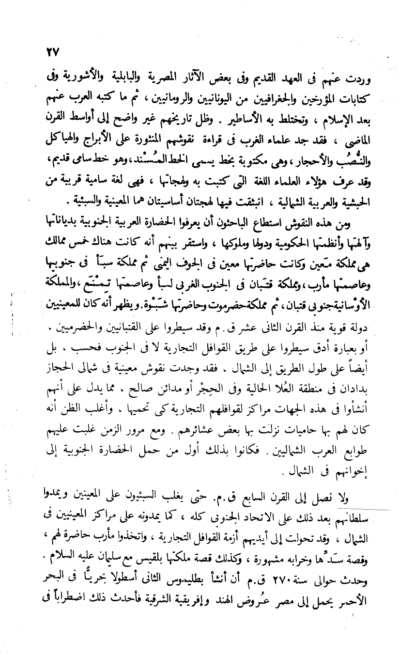 وكان المعروف عن هؤلاء العرب الجنوبيين قليلا، فهو لا يتجاوز إشارات وردت عنهم فى العهد القديم وفى بعض الآثار المصرية والبابلية والأشورية وفى كتابات المؤرخين والجغرافيين من اليونانيين والرومانيين، ثم ما كتبه العرب عنهم بعد الإسلام، وتختلط به الأساطير. وظل تاريخهم غير واضح إلى أواسط القرن الماضى، فقد جد علماء الغرب فى قراءة نقوشهم المنثورة على الأبراج والهياكل والنّصب والأحجار، وهى مكتوبة بخط يسمى الخط المسند، وهو خط سامى قديم، وقد عرف هؤلاء العلماء اللغة التى كتبت به ولهجاتها، فهى لغة سامية قريبة من الحبشية والعربية الشمالية، انبثقت فيها لهجتان أساسيتان هما المعينية والسبئية.
