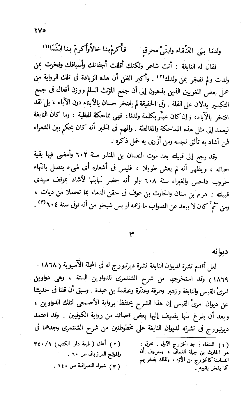 (¬1) العنقاء: جد الخزرج الأول. محرق: هو الحارث بن جبلة الغسانى، ومعروف أن الغساسنة كالخزرج من الأزد، ولذلك يفخر بهم كما يفخر بقومه.