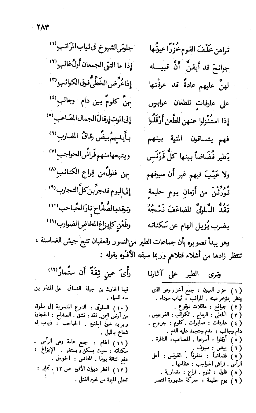 (¬10) السلوقى: الدرع المنسوبة إلى سلوق من أرض اليمن. تقد: تشق. الصفاح: الحجارة ويريد خوذ الجنود. الحباحب: ذباب له شعاع بالليل.