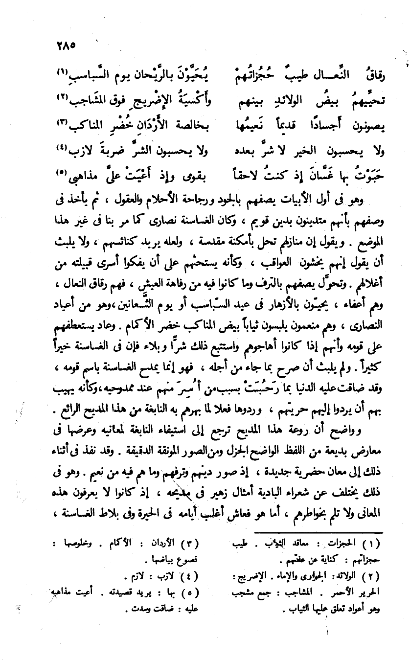 وهو فى أول الأبيات يصفهم بالجود ورجاحة الأحلام والعقول، ثم يأخذ فى وصفهم بأنهم متدينون بدين قويم، وكان الغساسنة نصارى كما مر بنا فى غير هذا الموضع، ويقول إن منازلهم تحل بأمكنة مقدسة، ولعله يريد كنائسهم، ولا يلبث أن يقول إنهم يخشون العواقب، وكأنه يستحثهم على أن يفكوا أسرى قبيلته من أغلالهم. وتحوّل يصفهم بالترف وما كانوا فيه من رفاهة العيش، فهم رقاق النعال، وهم أعفاء، يحيّون بالأزهار فى عيد السّباسب أو يوم الشّعانين، وهو من أعياد النصارى، وهم منعمون يلبسون ثيابا بيض المناكب خضر الأكمام. وعاد يستعطفهم على قومه وأنهم إذا كانوا أهاجوهم واستتبع ذلك شرّا وبلاء فإن فى الغساسنة خيرا كثيرا. ولم يلبث أن صرح بما جاء من أجله، فهو إنما يمدح الغساسنة باسم قومه، وقد ضاقت عليه الدنيا بما رحبت بسبب من أسر منهم عند ممدوحيه، وكأنه يهيب بهم أن يردوا إليهم حريتهم، وردوها فعلا لما بهرهم به النابغة من هذا المديح الرائع.