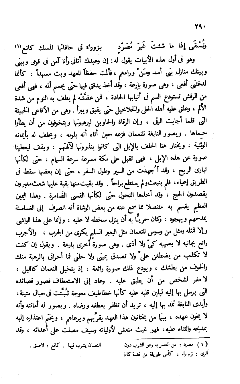 (¬1) مصرد: من التصريد وهو الشرب دون الرى. زوراء: كأس طويلة من فضة كان النعمان يشرب فيها. كانع: لاصق.