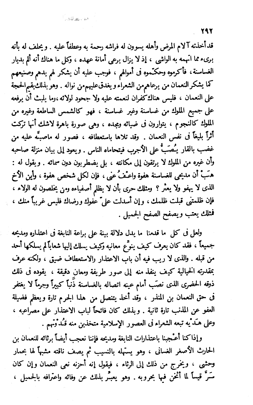 هب أن مديحى للغساسنة هفوة واعف عنى، فإن لكل شخص هفوة، وأين الأخ الذى لا يهفو ولا يعثر؟ ومثلك حرى بأن لا يظلم أصفياءه ومن يخلصون له الولاء، فإن ظلمتنى قبلت ظلمك، وإن أسدلت علىّ عفوك ورضاك فليس غريبا منك، فمثلك يعتب ويصفح الصفح الجميل.