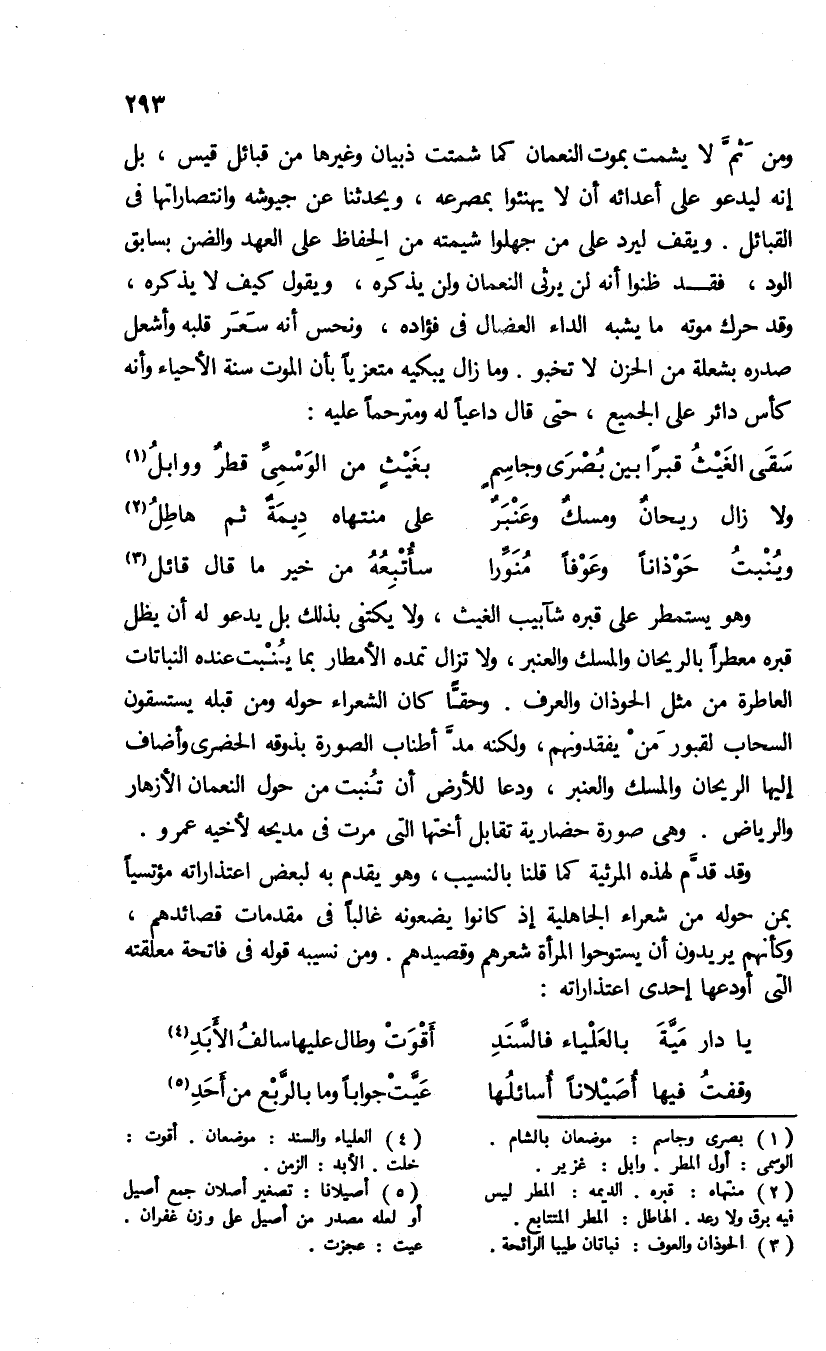 وهو يستمطر على قبره شآبيب الغيث، ولا يكتفى بذلك بل يدعو له أن يظل قبره معطرا بالريحان والمسك والعنبر، ولا تزال تمده الأمطار بما ينبت عنده النباتات العاطرة من مثل الحوذان والعرف. وحقّا كان الشعراء حوله ومن قبله يستسقون السحاب لقبور من يفقدونهم، ولكنه مدّ أطناب الصورة بذوقه الحضرى وأضاف إليها الريحان والمسك والعنبر، ودعا للأرض أن تنبت من حول النعمان الأزهار والرياض. وهى صورة حضارية تقابل أختها التى مرت فى مديحه لأخيه عمرو.