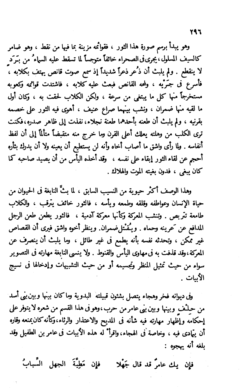 وهذا الوصف أكثر حيوية من النسيب السابق، لما بثّ النابغة فى الحيوان من حياة الإنسان وعواطفه وقلقه وطمعه ويأسه، فالثور خائف يترقب، والكلاب طامعة تتربص. وتنشب المعركة وكأنها معركة آدمية، فالثور يطعن طعن الرجل المدافع عن عرينه وحماه. ويقتل ضمران. وينظر أخوه واشق فيرى أن القصاص غير ممكن، وتحدثه نفسه بأنه يطمع فى غير طائل، وما يلبث أن ينصرف عن المعركة، وقد قذفت به فى مهاوى اليأس والقنوط. ولا ينسى النابغة مهارته فى التصوير سواء من حيث تمثيل المنظر وتجسيمه أو من حيث التشبيهات وإدخالها فى نسيج الأبيات.