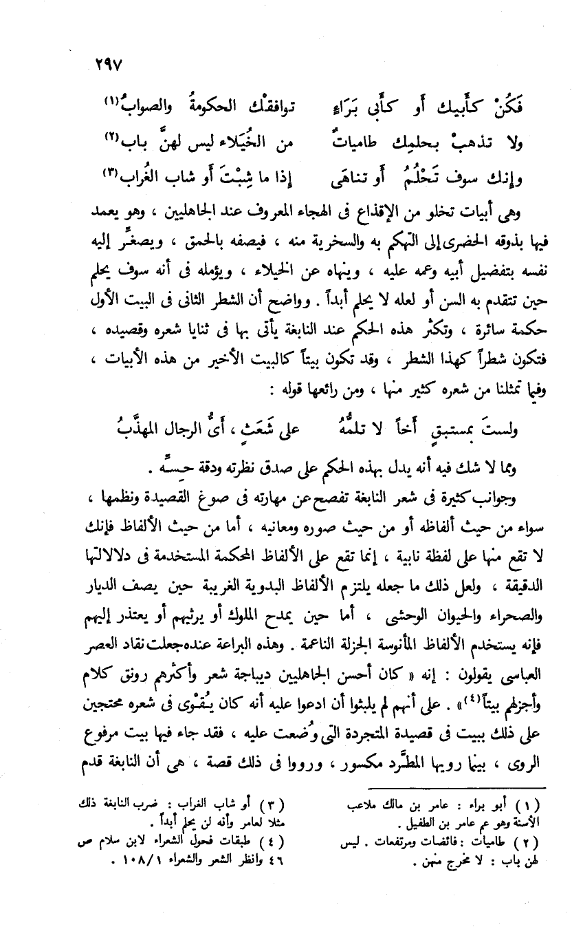 وهى أبيات تخلو من الإقذاع فى الهجاء المعروف عند الجاهليين، وهو يعمد فيها بذوقه الحضرى إلى التهكم به والسخرية منه، فيصفه بالحمق، ويصغّر إليه نفسه بتفضيل أبيه وعمه عليه، وينهاه عن الخيلاء، ويؤمله فى أنه سوف يحلم حين تتقدم به السن أو لعله لا يحلم أبدا. وواضح أن الشطر الثانى فى البيت الأول حكمة سائرة، وتكثر هذه الحكم عند النابغة يأتى بها فى ثنايا شعره وقصيده، فتكون شطرا كهذا الشطر، وقد تكون بيتا كالبيت الأخير من هذه الابيات، وفيما تمثلنا من شعره كثير منها، ومن رائعها قوله: