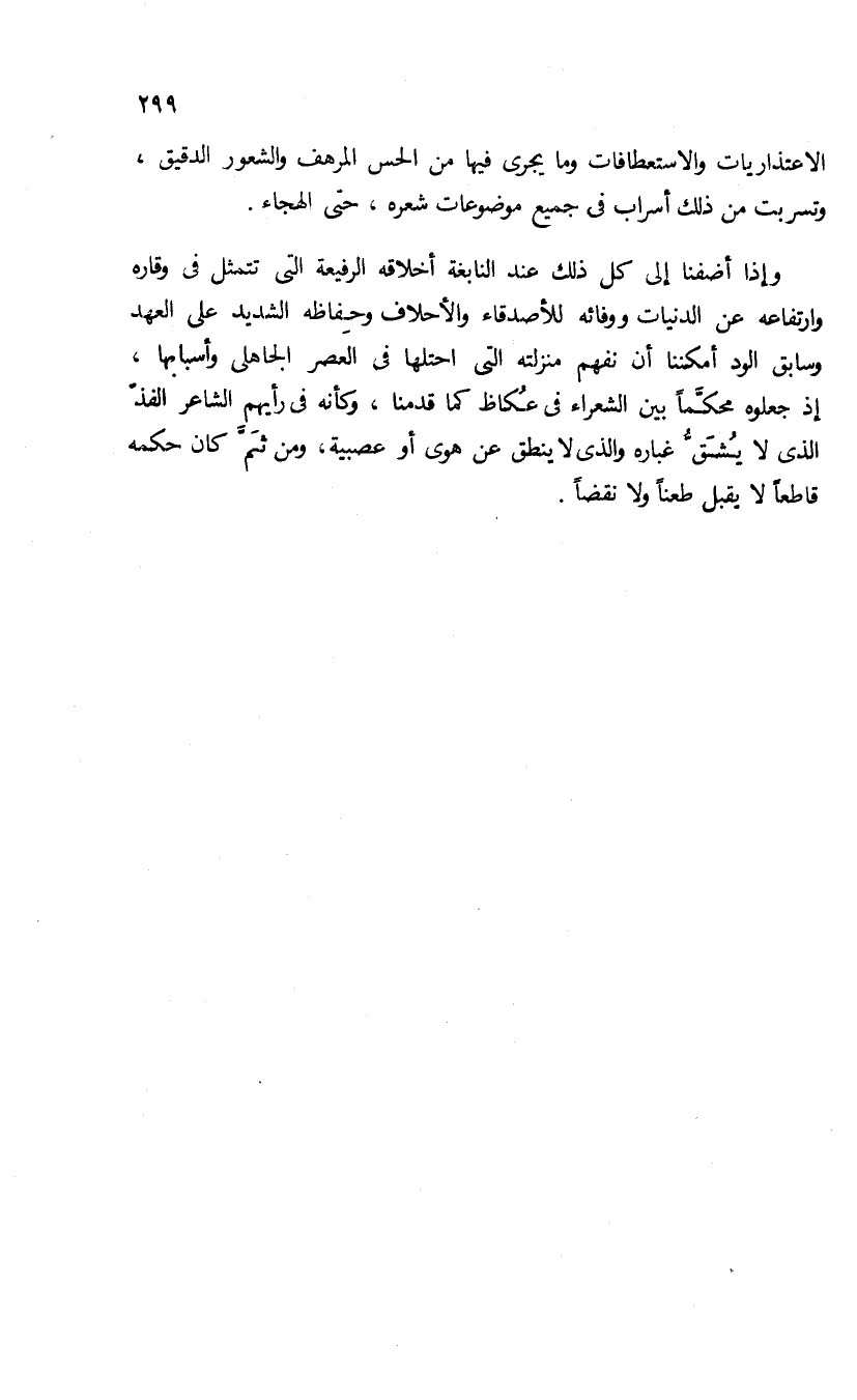 وإذا أضفنا إلى كل ذلك عند النابغة أخلاقه الرفيعة التى تتمثل فى وقاره وارتفاعه عن الدنيات ووفائه للأصدقاء والأحلاف وحفاظه الشديد على العهد وسابق الود أمكننا أن نفهم منزلته التى احتلها فى العصر الجاهلى وأسبابها، إذ جعلوه محكّما بين الشعراء فى عكاظ كما قدمنا، وكأنه فى رأيهم الشاعر الفذّ الذى لا يشقّ غباره والذى لا ينطق عن هوى أو عصبية، ومن ثمّ كان حكمه قاطعا لا يقبل طعنا ولا نقضا.