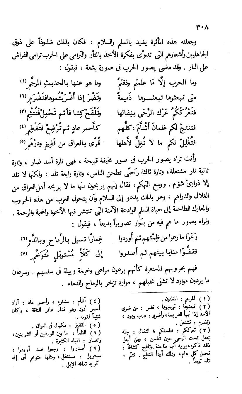 وأنت تراه يصور الحرب فى صور مخيفة قبيحة، فهى تارة أسد ضار، وتارة ثانية نار مشتعلة، وتارة ثالثة رحى تطحن الناس، وتارة رابعة تلد، ولكنها لا تلد إلا ذرارى شؤم. ووسع التهكم، فقال إنهم يربحون منها ما لا يربحه أهل العراق من الغلال والدراهم. وهو بذلك يدعو إلى السلام وأن يتحول العرب من هذه الحروب والمعارك الطاحنة إلى حياة السلم الوادعة الآمنة التى تنتشر فيها الأخوة والمحبة والرحمة.