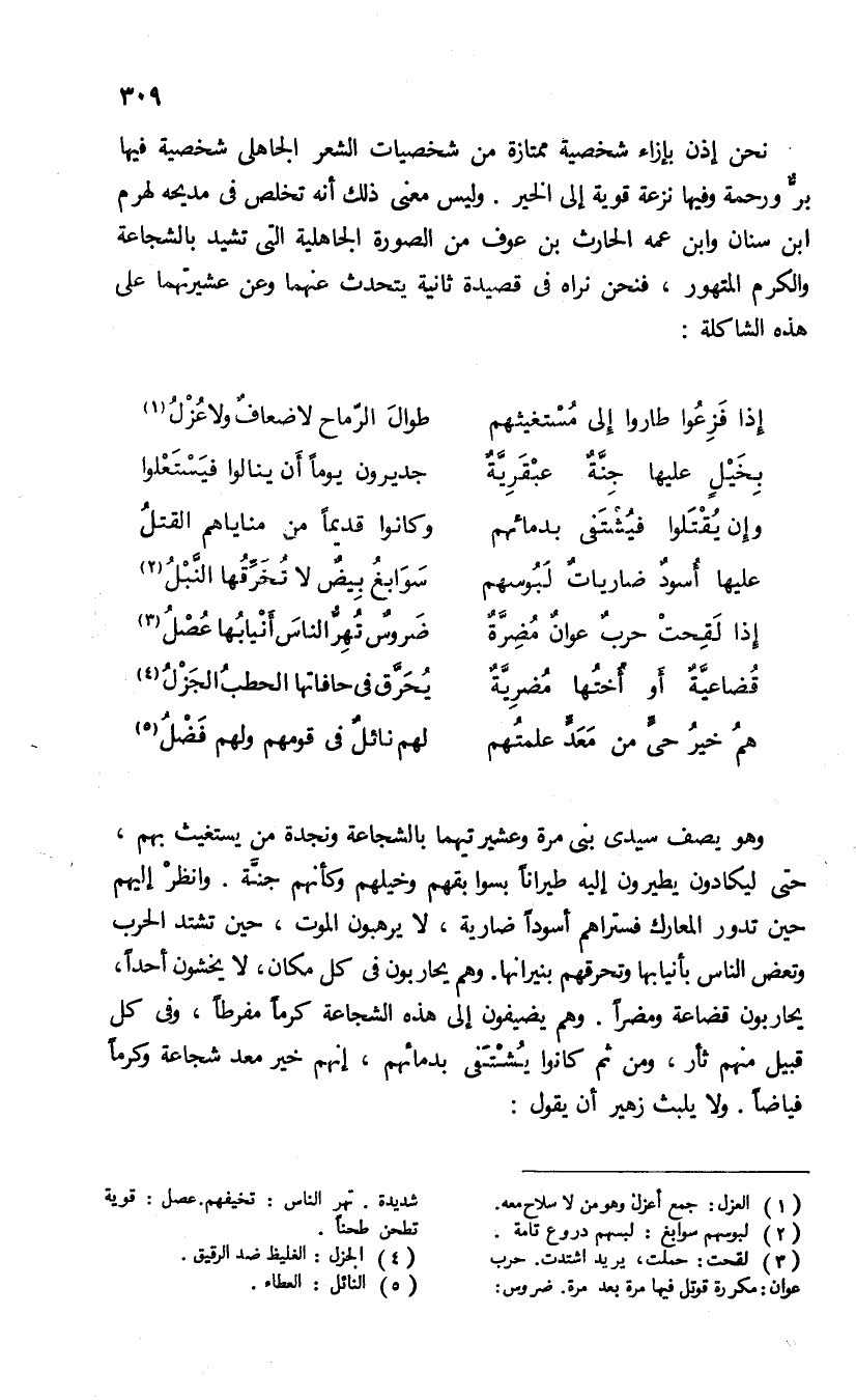 وهو يصف سيدى بنى مرة وعشيرتيهما بالشجاعة ونجدة من يستغيث بهم، حتى ليكادون يطيرون إليه طيرانا بسوابقهم وخيلهم وكأنهم جنة. وانظر إليهم حين تدور المعارك فستراهم أسودا ضارية، لا يرهبون الموت، حين تشتد الحرب وتعض الناس بأنيابها وتحرقهم بنيرانها. وهم يحاربون فى كل مكان، لا يخشون أحدا، يحاربون قضاعة ومضرا. وهم يضيفون إلى هذه الشجاعة كرما مفرطا. وفى كل قبيل منهم ثأر، ومن ثم كانوا يشتفى بدمائهم، إنهم خير معد شجاعة وكرما فياضا. ولا يلبث زهير أن يقول: