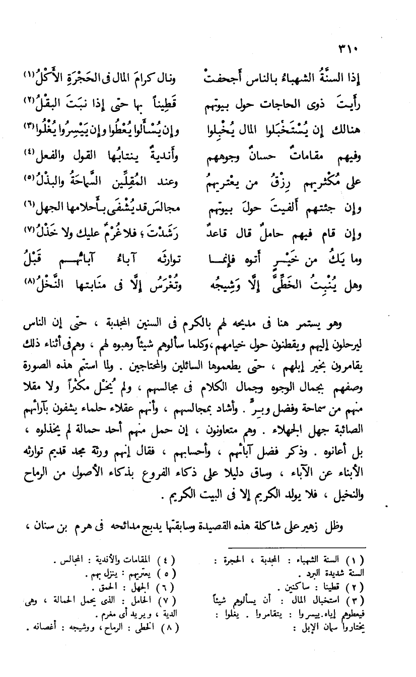 وهو يستمر هنا فى مديحه لهم بالكرم فى السنين المجدبة، حتى إن الناس ليرحلون إليهم ويقطنون حول خيامهم، وكلما سألوهم شيئا وهبوه لهم. وهم فى أثناء ذلك يقامرون بخير إبلهم، حتى يطعموها السائلين والمحتاجين. ولما استتم هذه الصورة وصفهم بجمال الوجوه وجمال الكلام فى مجالسهم، ولم يخل مكثرا ولا مقلا منهم من سماحة وفضل وبر. وأشاد بمجالسهم، وأنهم عقلاء حلماء يشفون بآرائهم الصائبة جهل الجهلاء. وهم متعاونون، إن حمل منهم أحد حمالة لم يخذلوه، بل أعانوه. وذكر فضل آبائهم وأحسابهم، فقال إنهم ورثة مجد قديم توارثه الأبناء عن الآباء، وساق دليلا على ذكاء الفروع بذكاء الأصول من الرماح والنخيل، فلا يولد الكريم إلا فى البيت الكريم.
