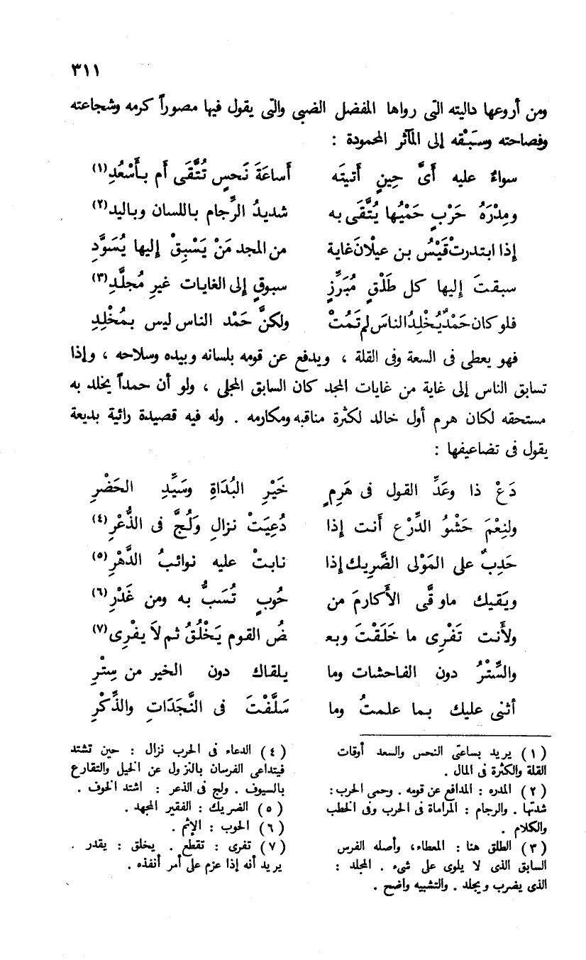 ومن أروعها داليته التى رواها المفضل الضبى والتى يقول فيها مصورا كرمه وشجاعته وفصاحته وسبقه إلى المآثر المحمودة: