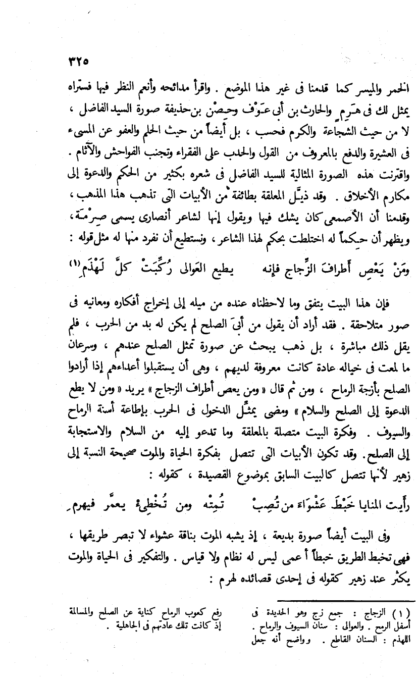 فإن هذا البيت يتفق وما لاحظناه عنده من ميله إلى إخراج أفكاره ومعانيه فى صور متلاحقة. فقد أراد أن يقول من أبى الصلح لم يكن له بد من الحرب، فلم يقل ذلك مباشرة، بل ذهب يبحث عن صورة تمثل الصلح عندهم، وسرعان ما لمعت فى خياله عادة كانت معروفة لديهم، وهى أن يستقبلوا أعداءهم إذا أرادوا الصلح بأزجة الرماح، ومن ثم قال «ومن يعص أطراف الزجاج» يريد «ومن لا يطع الدعوة إلى الصلح والسلام» ومضى يمثّل الدخول فى الحرب بإطاعة أسنة الرماح والسيوف. وفكرة البيت متصلة بالمعلقة وما تدعو إليه من السلام والاستجابة إلى الصلح. وقد تكون الأبيات التى تتصل بفكرة الحياة والموت صحيحة النسبة إلى زهير لأنها تتصل كالبيت السابق بموضوع القصيدة، كقوله: