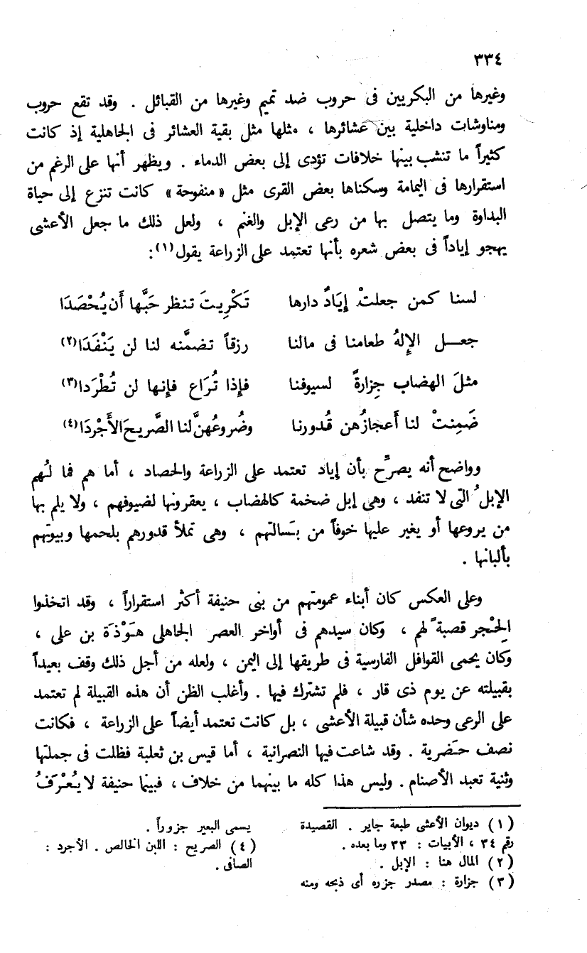 وغيرها من البكريين فى حروب ضد تميم وغيرها من القبائل. وقد تقع حروب ومناوشات داخلية بين عشائرها، مثلها مثل بقية العشائر فى الجاهلية إذ كانت كثيرا ما تنشب بينها خلافات تؤدى إلى بعض الدماء. ويظهر أنها رغم استقرارها فى اليمامة وسكناها بعض القرى مثل «منفوحة» كانت تنزع إلى حياة. البداوة وما يتصل بها من رعى الإبل والغنم، ولعل ذلك ما جعل الأعشى يهجو إيادا فى بعض شعره بأنها تعتمد على الزراعة يقول (¬1):