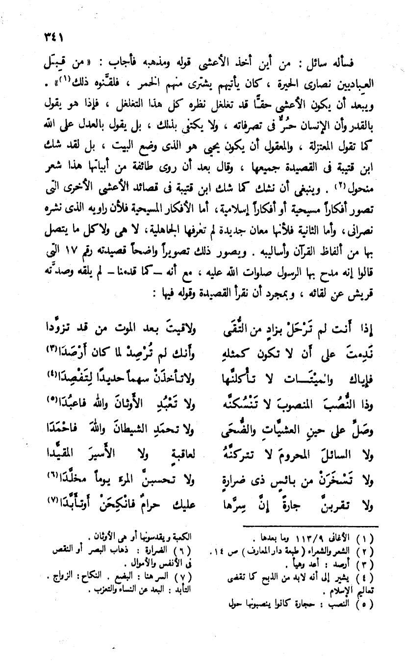 فسأله سائل: من أين أخذ الأعشى قوله ومذهبه فأجاب: «من قبل العباديين نصارى الحيرة، كان يأتيهم يشترى منهم الخمر، فلقنوه ذلك (¬1)».