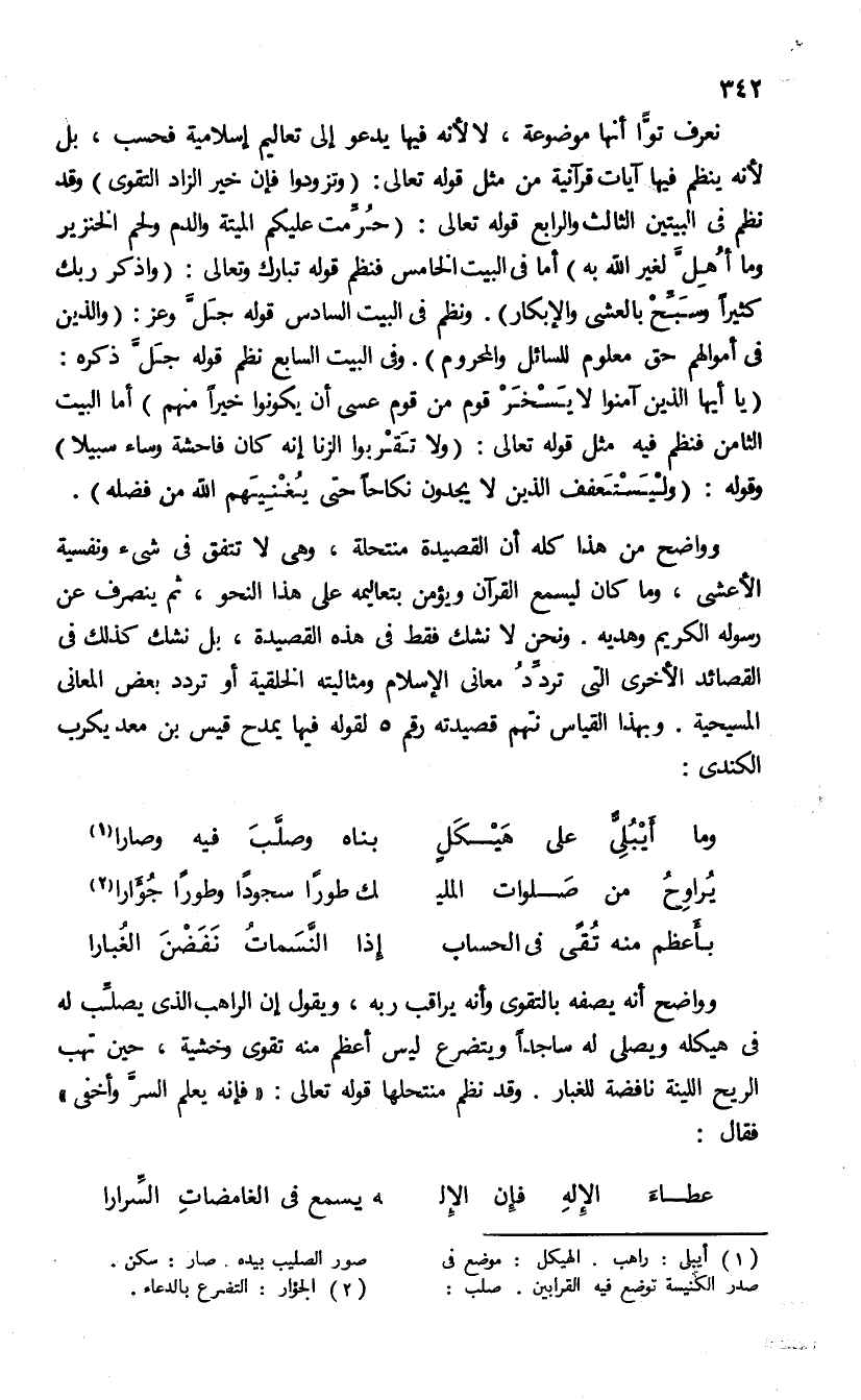 وواضح من هذا كله أن القصيدة منتحلة، وهى لا تتفق فى شئ ونفسية الأعشى، وما كان ليسمع القرآن ويؤمن بتعاليمه على هذا النحو، ثم ينصرف عن رسوله الكريم وهديه. ونحن لا نشك فقط فى هذه القصيدة، بل نشك كذلك فى القصائد الأخرى التى تردّد معانى الإسلام ومثاليته الخلقية أو تردد بعض المعانى المسيحية. وبهذا القياس نتهم قصيدته رقم 5 لقوله فيها يمدح قيس بن معد يكرب الكندى: