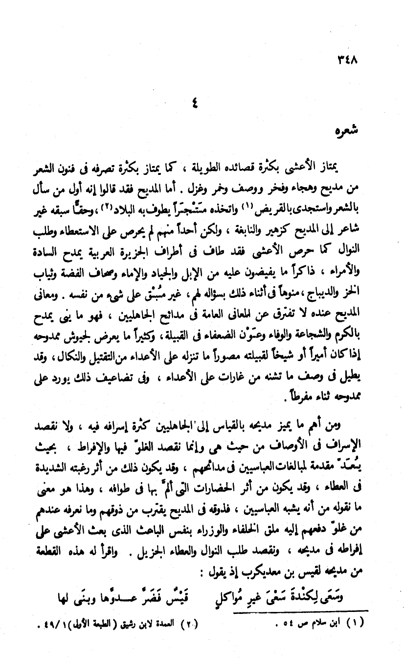 ومن أهم ما يميز مديحه بالقياس إلى الجاهليين كثرة إسرافه فيه، ولا نقصد الإسراف فى الأوصاف من حيث هى وإنما نقصد الغلوّ فيها والإفراط، بحيث يعد مقدمة لمبالغات العباسيين فى مدائحهم. وقد يكون ذلك من أثر رغبته الشديدة فى العطاء، وقد يكون من أثر الحضارات التى ألمّ بها فى طوافه، وهذا هو معنى ما نقوله من أنه يشبه العباسيين، فذوقه فى المديح يقترب من ذوقهم وما نعرفه عندهم من غلوّ دفعهم إليه ملق الخلفاء والوزراء بنفس الباعث الذى بعث الأعشى على إفراطه فى مديحه، ونقصد طلب النوال والعطاء الجزيل. واقرأ له هذه القطعة من مديحه لقيس بن معد يكرب إذ يقول: