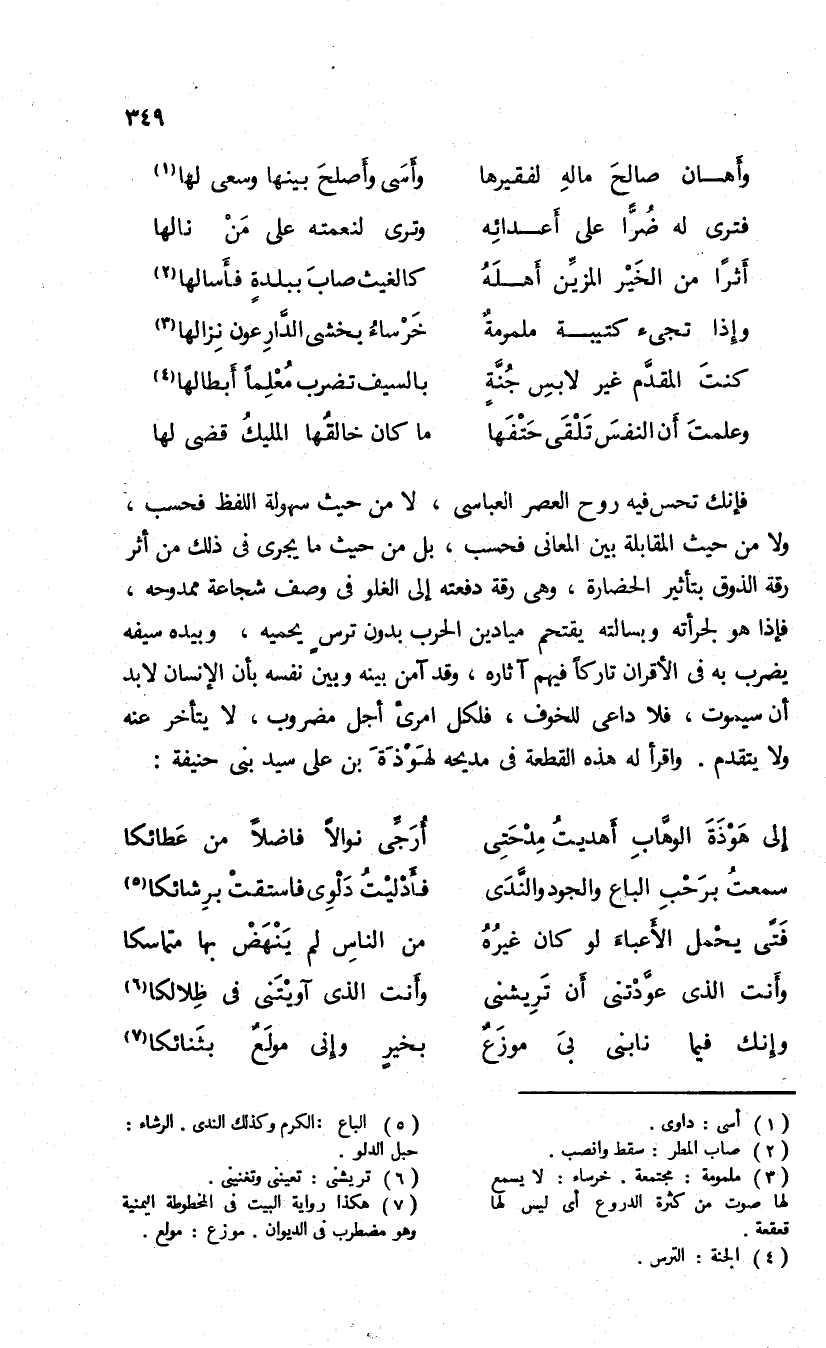 فإنك تحس فيه روح العصر العباسى، لا من حيث سهولة اللفظ فحسب، ولا من حيث المقابلة بين المعانى فحسب، بل من حيث ما يجرى فى ذلك من أثر رقة الذوق بتأثير الحضارة، وهى رقة دفعته إلى الغلو فى وصف شجاعة ممدوحه، فإذا هو لجرأته وبسالته يقتحم ميادين الحرب غير لابس ترس يحميه، وبيده سيفه يضرب به فى الأقران تاركا فيهم آثاره. وقد آمن بينه وبين نفسه بأن الإنسان لا بد أن سيموت، فلا داعى للخوف، فلكل امرئ أجل مضروب. لا يتأخر عنه ولا يتقدم. واقرأ له هذه القطعة فى مديحه لهوذة بن على سيد بنى حنيفة: