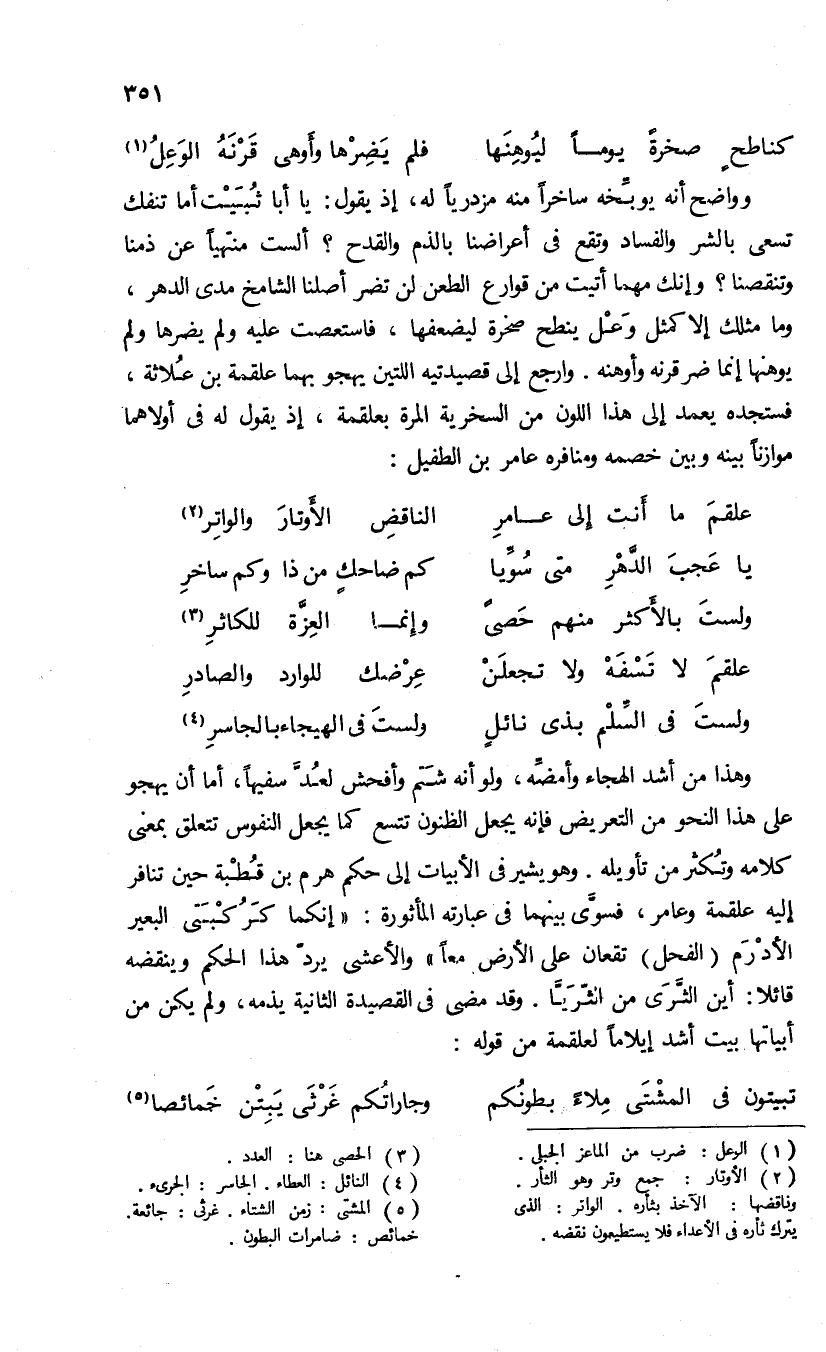وواضح أنه يوبّخه ساخرا منه مزدريا له، إذ يقول: يا أبا ثبيت أما تنفك تسعى بالشر والفساد وتقع فى أعراضنا بالذم والقدح؟ ألست منتهيا عن ذمنا وتنقصنا؟ وإنك مهما أتيت من قوارع الطعن لن تضر أصلنا الشامخ مدى الدهر، وما مثلك إلا كمثل وعل ينطح صخرة ليضعفها، فاستعصت عليه ولم يضرها ولم يوهنها إنما ضر قرنه وأوهنه. وارجع إلى قصيدتيه اللتين يهجو بهما علقمة بن علاثة، فستجده يعمد إلى هذا اللون من السخرية المرة بعلقمة، إذ يقول له فى أولاهما موازنا بينه وبين خصمه ومنافره عامر بن الطفيل:
