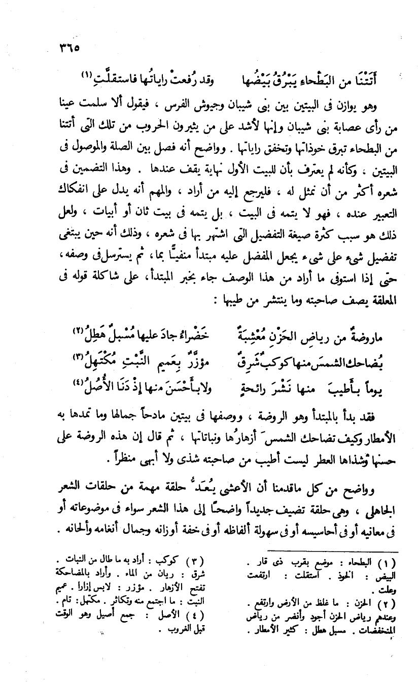 فقد بدأ بالمبتدأ وهو الروضة، ووصفها فى بيتين مادحا جمالها وما تمدها به الأمطار وكيف تضاحك الشمس أزهارها ونباتاتها، ثم قال إن هذه الروضة على حسنها وشذاها العطر ليست أطيب من صاحبته شذى ولا أبهى نظما