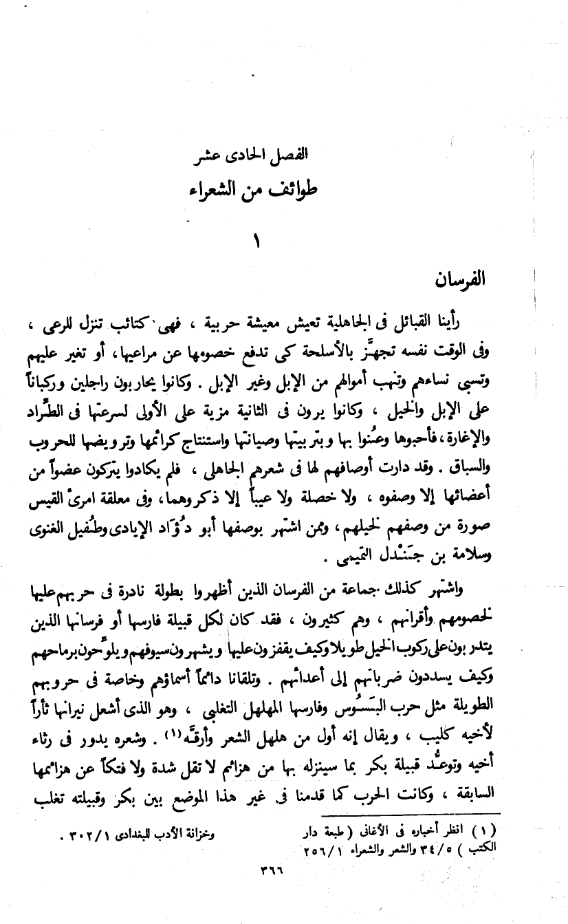 رأينا القبائل فى الجاهلية تعيش معيشة حربية، فهى كتائب تنزل للرعى، وفى الوقت نفسه تجهّز بالأسلحة كى تدفع خصومها عن مراعيها، أو تغير عليهم وتسبى نساءهم وتنهب أموالهم من الإبل وغير الإبل. وكانوا يحاربون راجلين وركبانا على الإبل والخيل، وكانوا يرون فى الثانية مزية على الأولى لسرعتها فى الطّراد والإغارة، فأحبوها وعنوا بها وبتربيتها وصيانتها واستنتاج كرائمها وترويضها للحروب والسباق. وقد دارت أوصافهم لها فى شعرهم الجاهلى، فلم يكادوا يتركون عضوا من أعضائها إلا وصفوه، ولا خصلة ولا عيبا إلا ذكروه، وفى معلقة امرئ القيس صورة من وصفهم لخيلهم، وممن اشتهر بوصفها أبو دواد الإيادى وطفيل الغنوى وسلامة بن جندل التميمى.