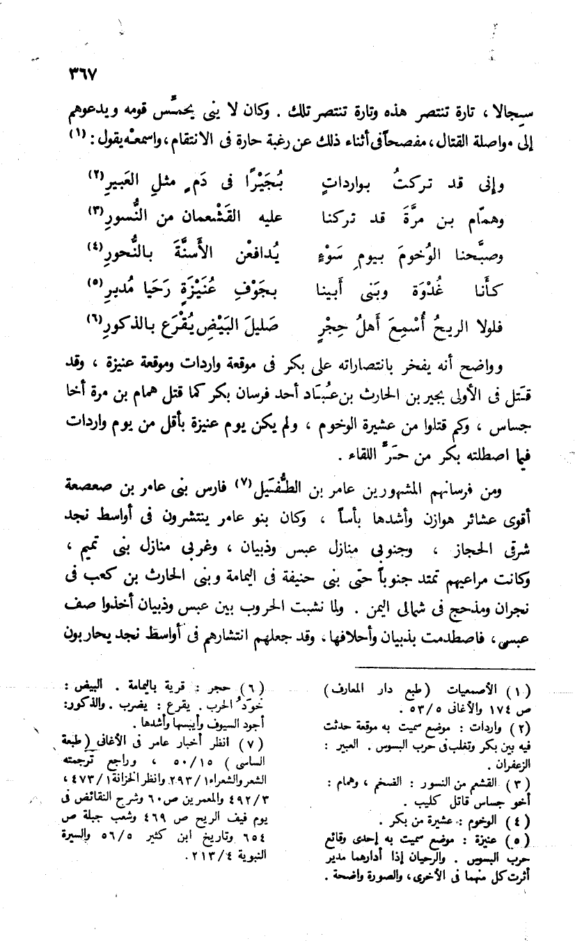 (¬7) انظر أخبار عامر فى الأغانى (طبعة الساسى) 15/ 50، وراجع ترجمته الشعر والشعراء 1/ 293 وانظر الخزانة 1/ 473، 3/ 492 والمعمرين ص 60 وشرح النقائض فى يوم فيف الريح ص 469 وشعب جبلة ص 654 وتاريخ ابن كثير 5/ 56 والسيرة النبوية 4/ 213.