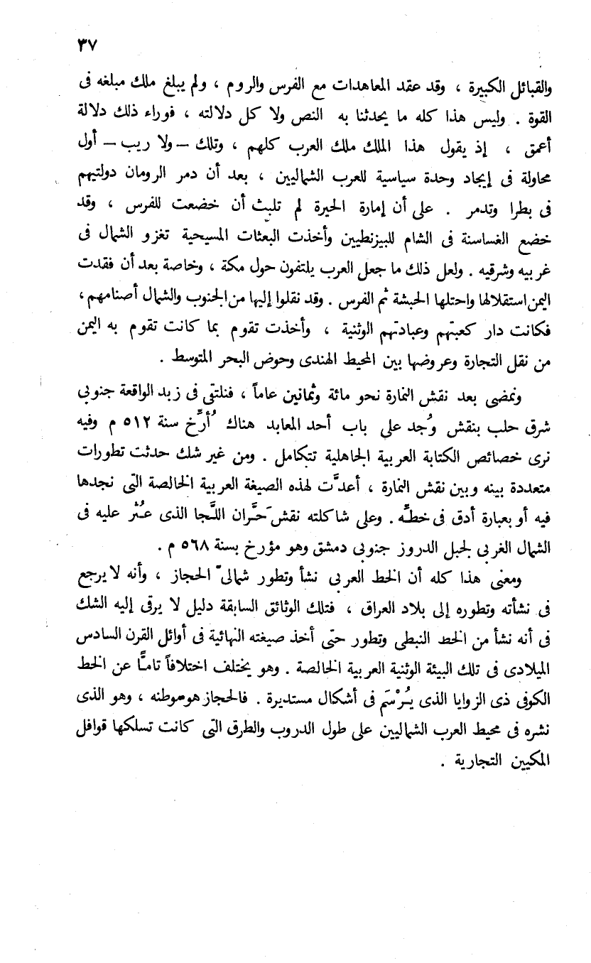 ومعنى هذا كله أن الخط العربى نشأ وتطور شمالىّ الحجاز، وأنه لا يرجع فى نشأته وتطوره إلى بلاد العراق، فتلك الوثائق السابقة دليل لا يرقى إليه الشك فى أنه نشأ من الخط النبطى وتطور حتى أخذ صيغته النهائية فى أوائل القرن السادس الميلادى فى تلك البيئة الوثنية العربية الخالصة. وهو يختلف اختلافا تامّا عن الخط الكوفى ذى الزوايا الذى يرسم فى أشكال مستديرة. فالحجاز هو موطنه، وهو الذى نشره فى محيط العرب الشماليين على طول الدروب والطرق التى كانت تسلكها قوافل المكيين التجارية.
