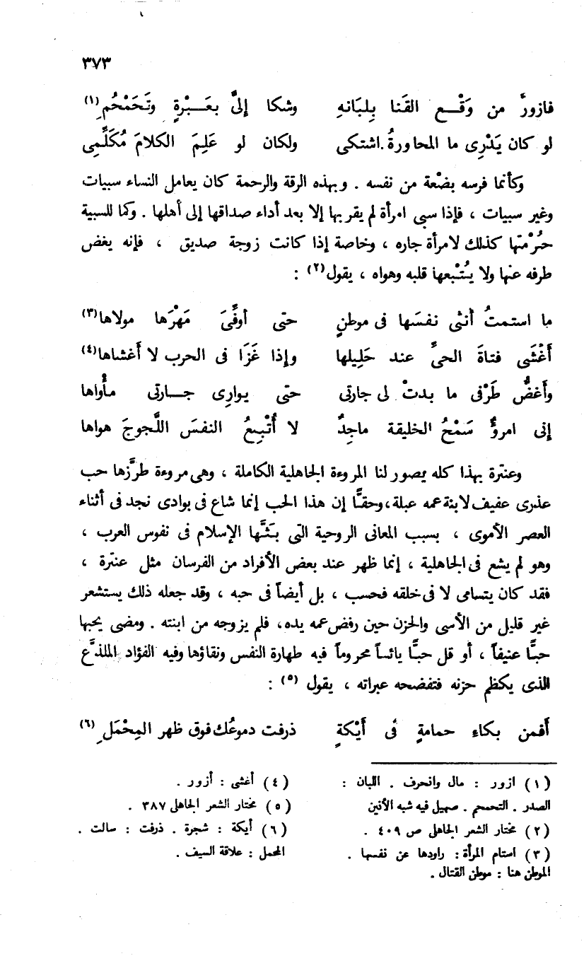 وعنترة بهذا كله يصور لنا المروءة الجاهلية الكاملة، وهى مروءة طرزها حب عذرى عفيف لابنة عمه عبلة. وحقا إن هذا الحب إنما شاع فى بوادى نجد فى أثناء العصر الأموى، بسبب المعانى الروحية التى بثّها الإسلام فى نفوس العرب، وهو لم يشع فى الجاهلية، إنما ظهر عند بعض الأفراد من الفرسان مثل عنترة، فقد كان يتسامى لا فى خلقه فحسب، بل أيضا فى حبه، وقد جعله ذلك يستشعر غير قليل من الأسى والحزن حين رفض عمه يده، فلم يزوجه من ابنته. ومضى يحبها حبا عنيفا، أو قل حبا يائسا محروما فيه طهارة النفس ونقاؤها وفيه الفؤاد الملذع الذى يكظم حزنه فتفضحه عبراته، يقول (¬5):