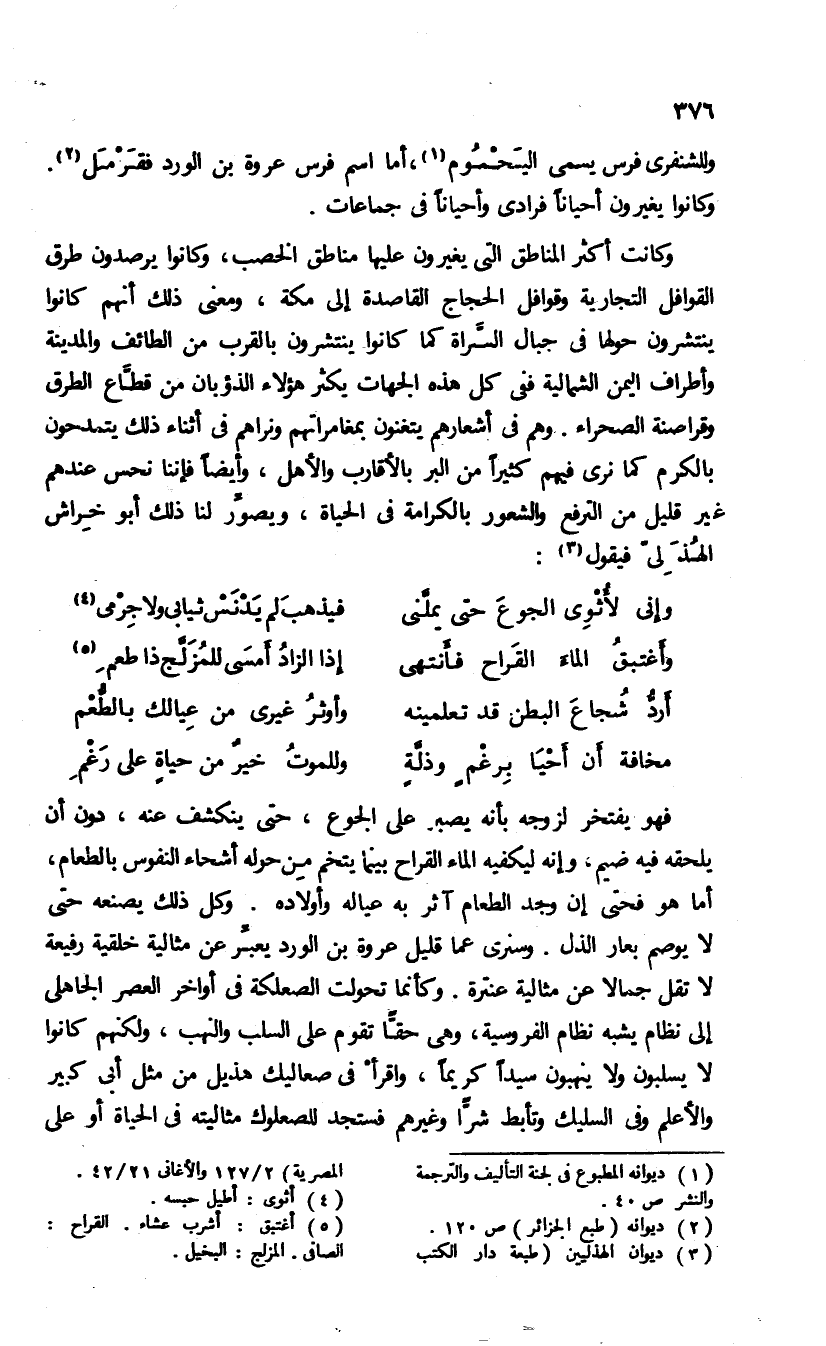فهو يفتخر لزوجه بأنه يصبر على الجوع، حتى ينكشف عنه، دون أن يلحقه فيه ضيم، وإنه ليكفيه الماء القراح بينما يتخم من حوله أشحاء النفوس بالطعام، أما هو فحتى إن وجد الطعام آثر به عياله وأولاده. وكل ذلك يصنعه حتى لا يوصم بعار الذل. وسنرى عما قليل عروة بن الورد يعبّر عن مثالية خلقية رفيعة لا تقل جمالا عن مثالية عنترة. وكأنما تحولت الصعلكة فى أواخر العصر الجاهلى إلى نظام يشبه نظام الفروسية، وهى حقا تقوم على السلب والنهب، ولكنهم كانوا لا يسلبون ولا ينهبون سيدا كريما، واقرأ فى صعاليك هذيل من مثل أبى كبير والأعلم وفى السليك وتأبط شرا وغيرهم فستجد للصعلوك مثاليته فى الحياة أو على