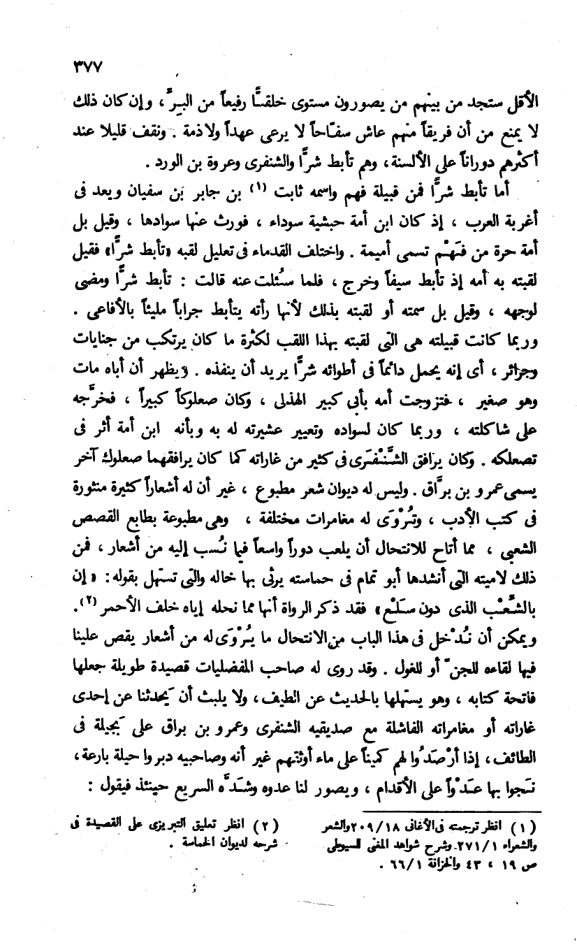 أما تأبّط شرّا فمن قبيلة فهم واسمه ثابت (¬1) بن جابر بن سفيان ويعد فى أغربة العرب، إذ كان ابن أمة حبشية سوداء، فورث عنها سوادها، وقيل بل أمه حرة من فهم تسمى أميمة. واختلف القدماء فى تعليل لقبه «تأبط شرا» فقيل لقبته به أمه إذ تأبط سيفا وخرج، فلما سئلت عنه قالت: تأبط شرا ومضى لوجهه، وقيل بل سمته أو لقبته بذلك لأنها رأته يتأبط جرابا مليئا بالأفاعى.