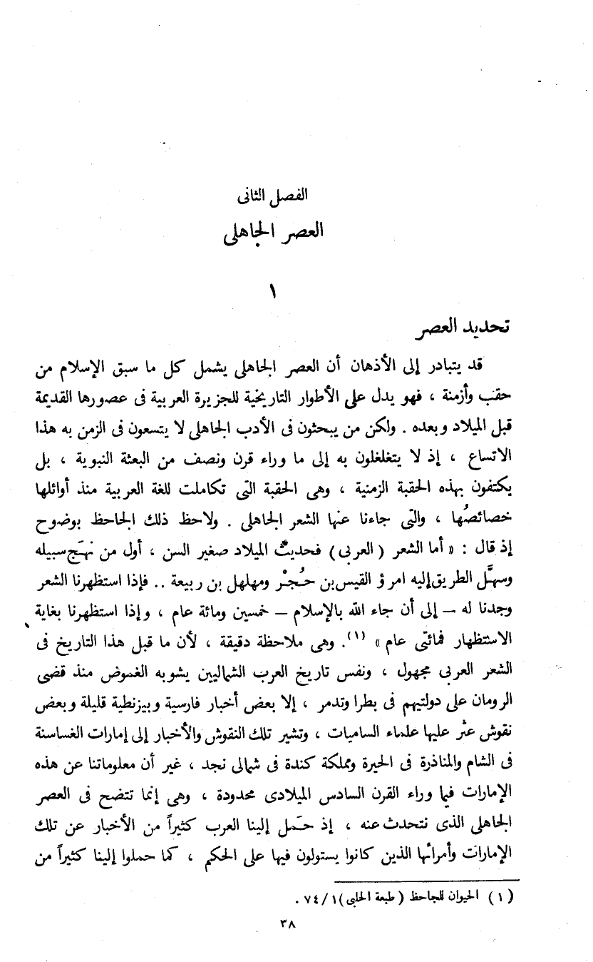 قد يتبادر إلى الأذهان أن العصر الجاهلى يشمل كل ما سبق الإسلام من حقب وأزمنة، فهو يدل على الأطوار التاريخية للجزيرة العربية فى عصورها القديمة قبل الميلاد وبعده. ولكن من يبحثون فى الأدب الجاهلى لا يتسعون فى الزمن به هذا الاتساع، إذ لا يتغلغلون به إلى ما وراء قرن ونصف من البعثة النبوية، بل يكتفون بهذه الحقبة الزمنية، وهى الحقبة التى تكاملت للغة العربية منذ أوائلها خصائصها، والتى جاءنا عنها الشعر الجاهلى. ولاحظ ذلك الجاحظ بوضوح إذ قال: «أما الشعر (العربى) فحديث الميلاد صغير السن، أول من نهج سبيله وسهّل الطريق إليه امرؤ القيس بن حجر ومهلهل بن ربيعة. . فإذا استظهرنا الشعر وجدنا له-إلى أن جاء الله بالإسلام-خمسين ومائة عام، وإذا استظهرنا بغاية الاستظهار فمائتى عام» (¬1). وهى ملاحظة دقيقة، لأن ما قبل هذا التاريخ فى الشعر العربى مجهول، ونفس تاريخ العرب الشماليين يشوبه الغموض منذ قضى الرومان على دولتيهم فى بطرا وتدمر، إلا بعض أخبار فارسية وبيزنطية قليلة وبعض نقوش عثر عليها علماء الساميات، وتشير تلك النقوش والأخبار إلى إمارات الغساسنة فى الشام والمناذرة فى الحيرة ومملكة كندة فى شمالى نجد، غير أن معلوماتنا عن هذه الإمارات فيما وراء القرن السادس الميلادى محدودة، وهى إنما تتضح فى العصر الجاهلى الذى نتحدث عنه، إذ حمل إلينا العرب كثيرا من الأخبار عن تلك الإمارات وأمرائها الذين كانوا يستولون فيها على الحكم، كما حملوا إلينا كثيرا من